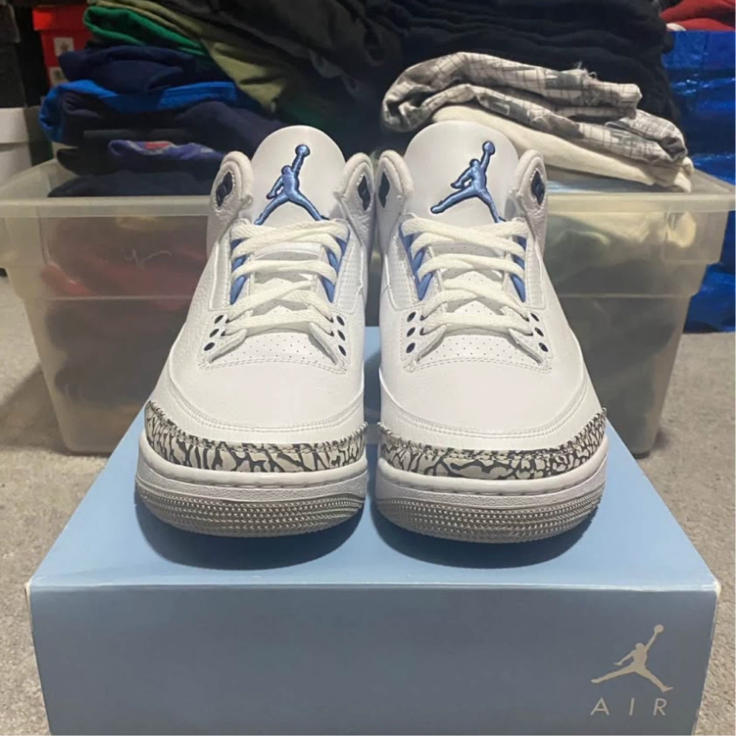 Selling a pair of Air Jordan 3 Retro UNC sneakers! They feature the iconic Jumpman logo and the classic elephant print detailing. Great for any sneakerhead or Jordan fan
