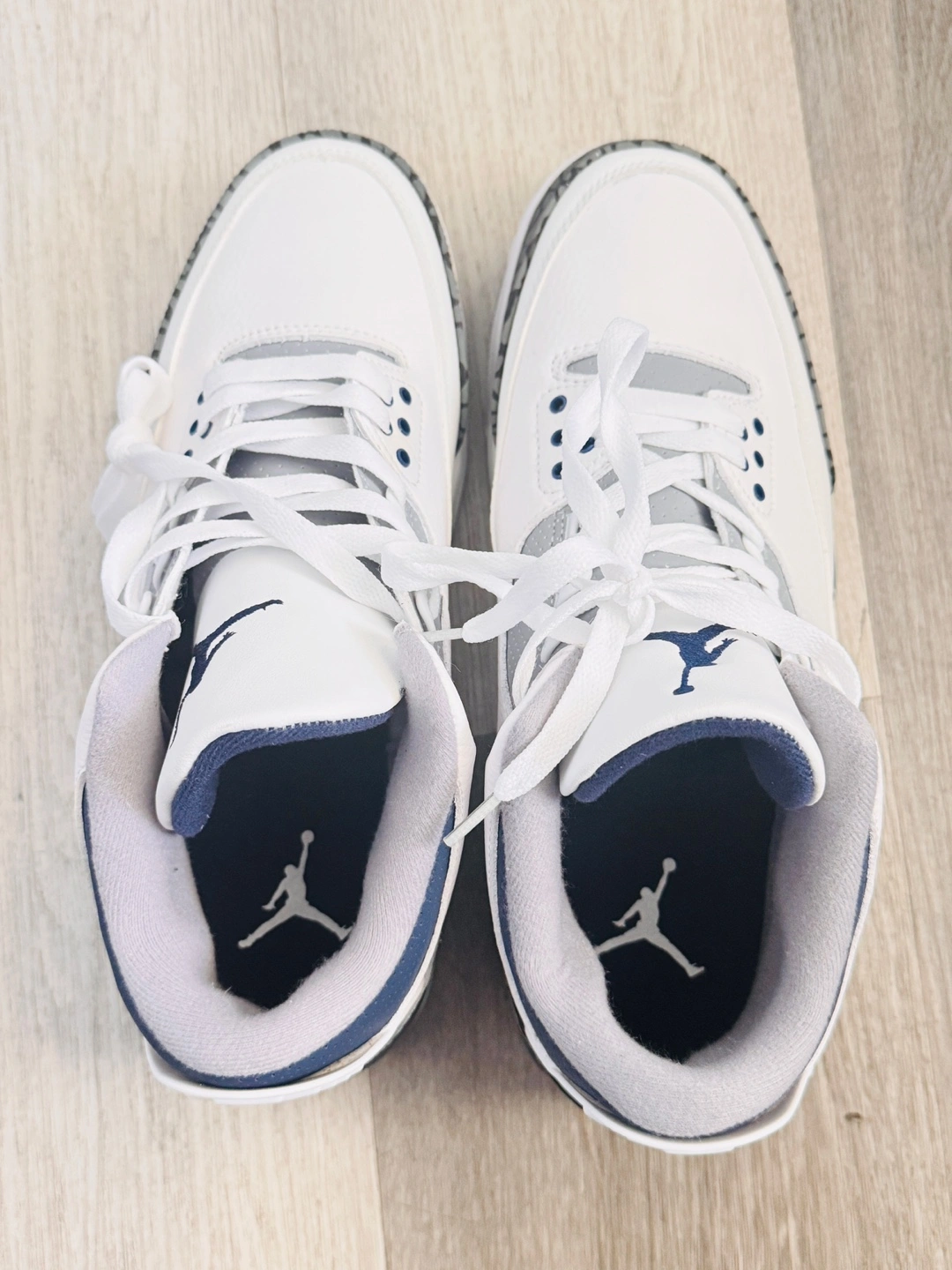 Selling a pair of Air Jordan 3 Retro sneakers in white and navy blue! They are in great condition and not used even 1 time and ready for a new home. These classic kicks are perfect for everyday wear or adding to your collection. Don't miss out!