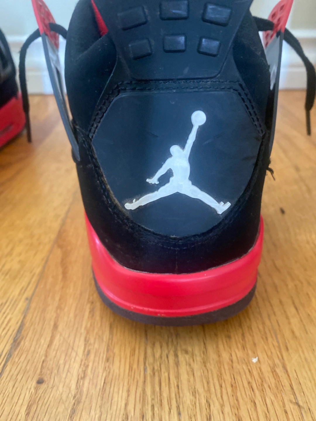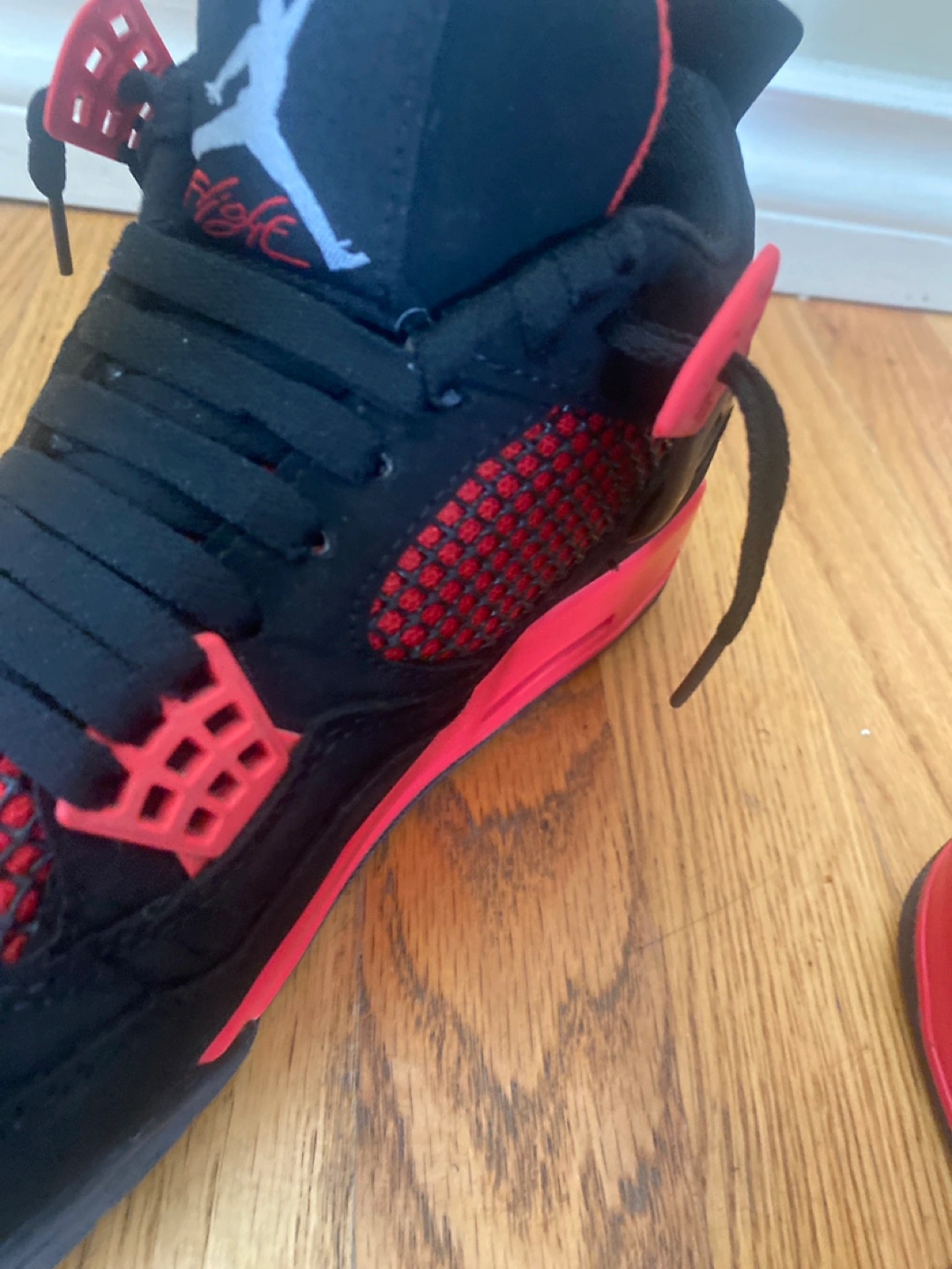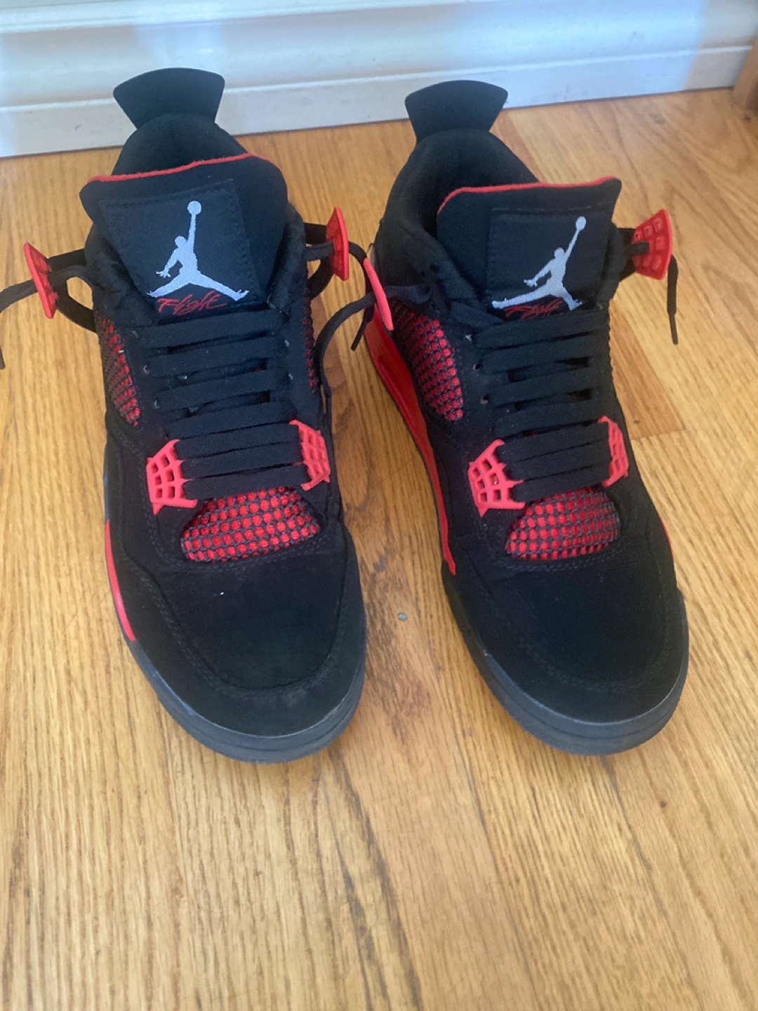 Red Thunder Jordan 4 sneakers. Slight wear visible. Pre-owned Open to offers + Trades Pickup In Cloverdale or King George Station **DM for more info**