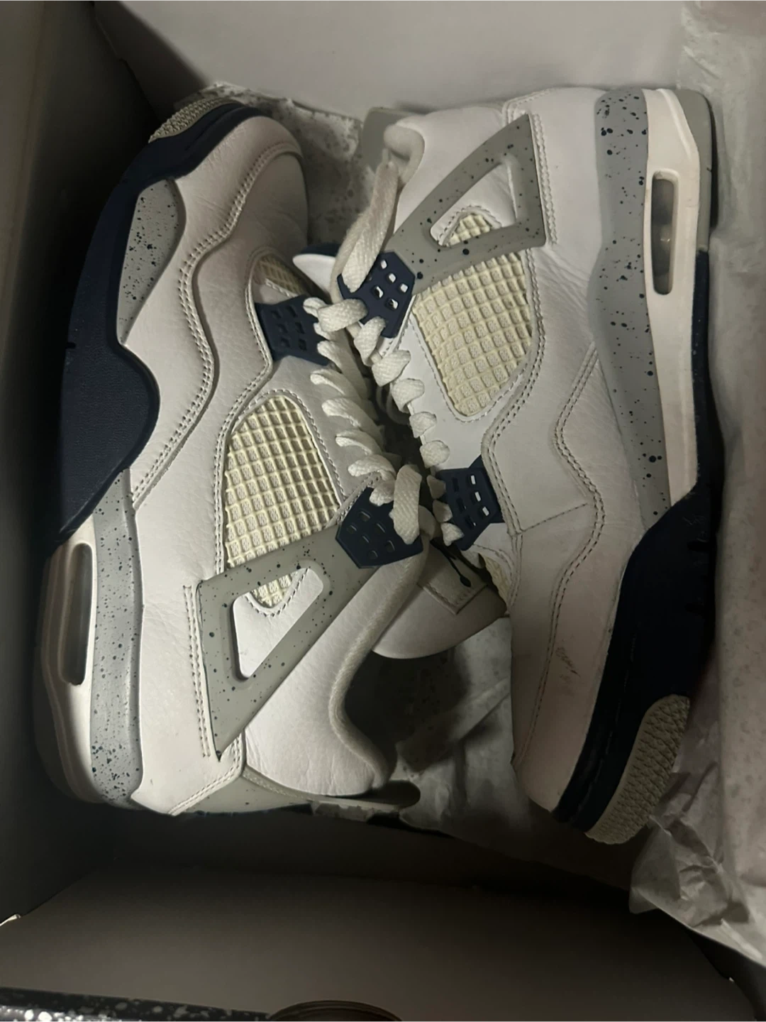 Selling a pair of Air Jordan 4 Retro sneakers in the White Midnight Navy colourway. They are a size 9.5 US. Comes with the original box!