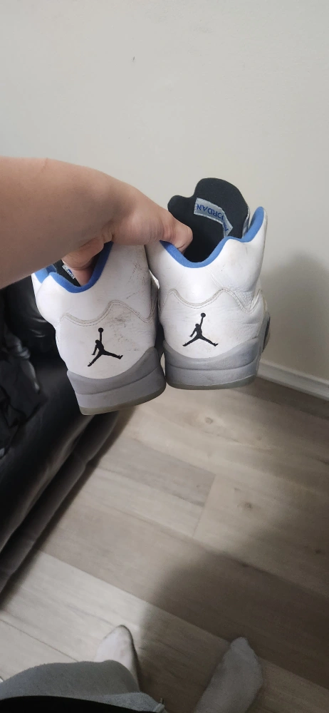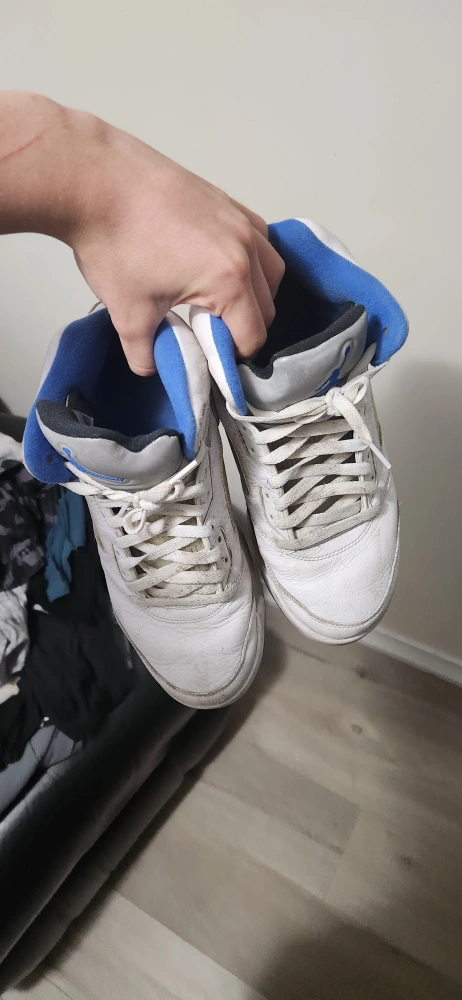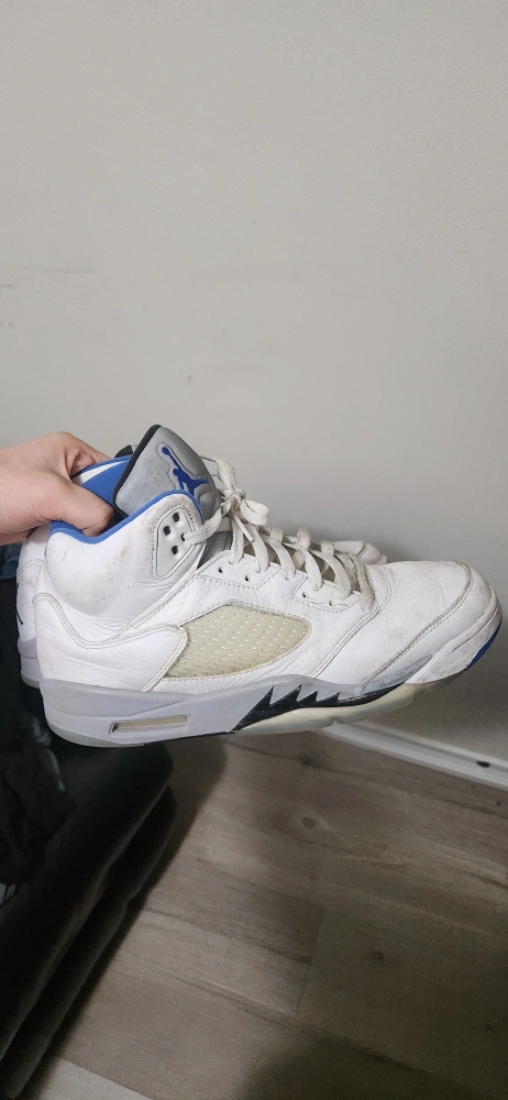 Selling a pair of Air Jordan 5 Retro sneakers in white and blue. They show signs of wear, but still have lots of life left!