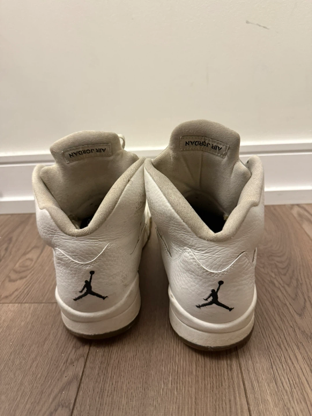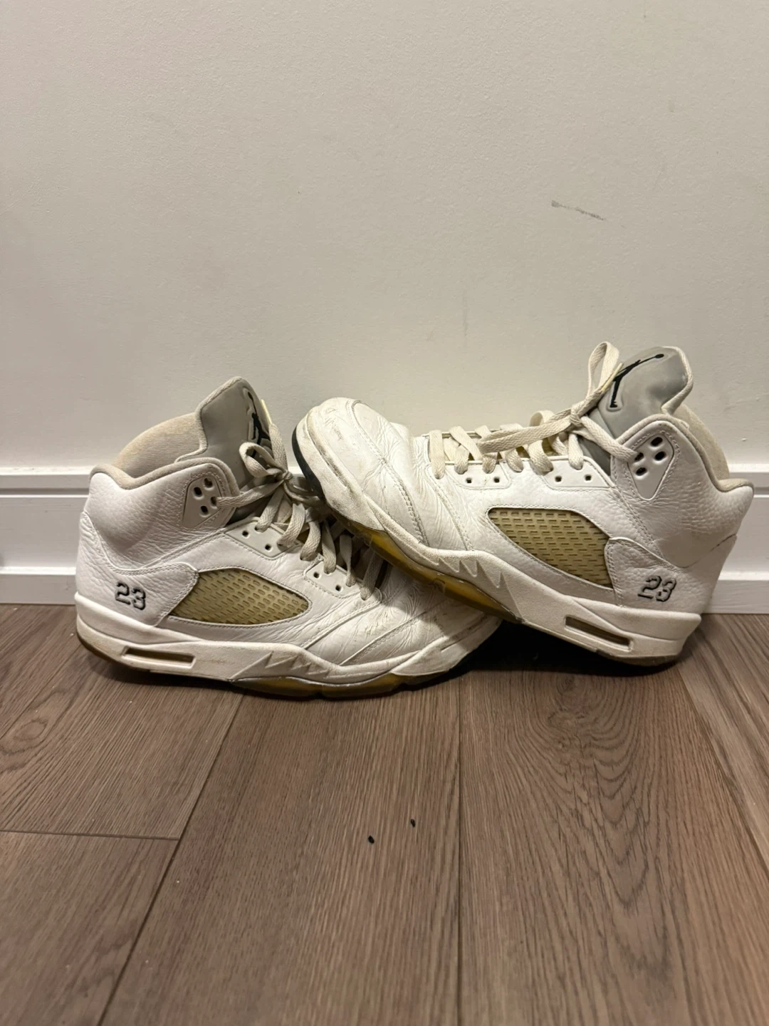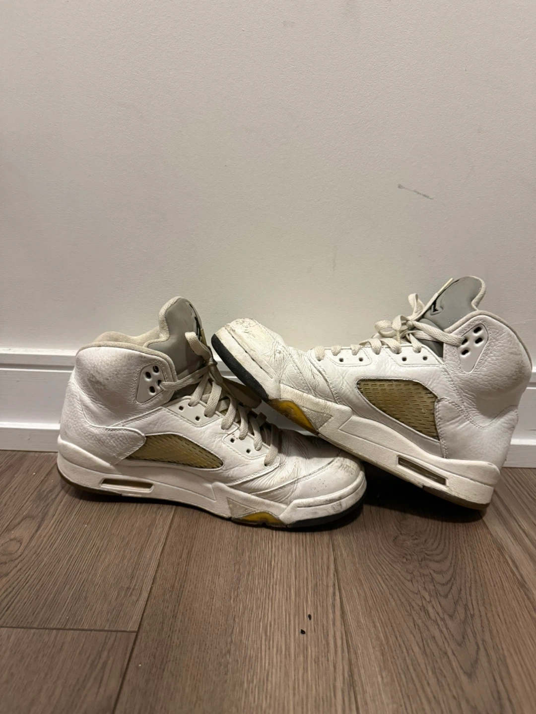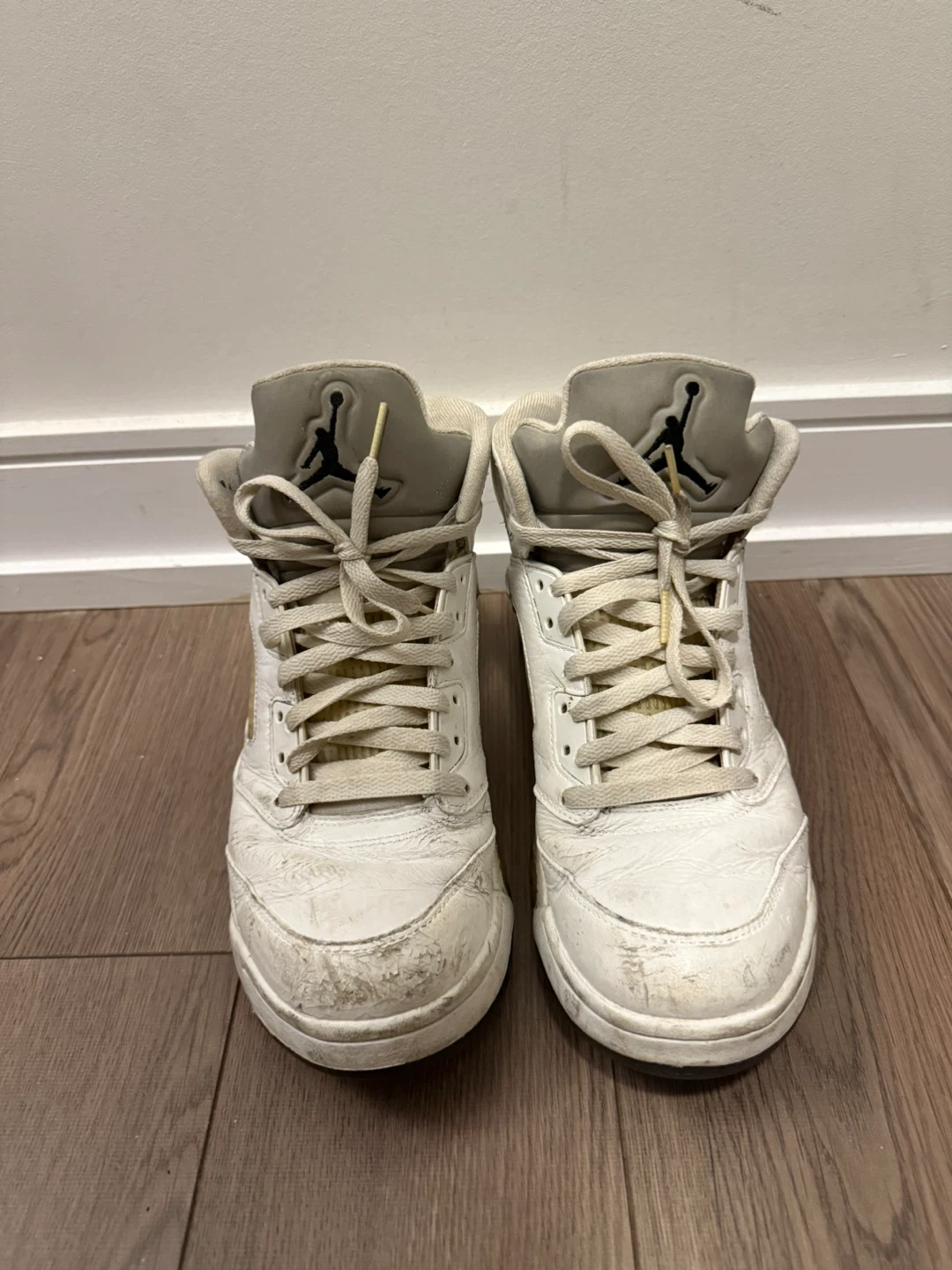 Selling a pair of Air Jordan 5 white metallics. They show signs of wear, as you can see in the pictures, but still have lots of life left in them! Pick up at kipling and dundas