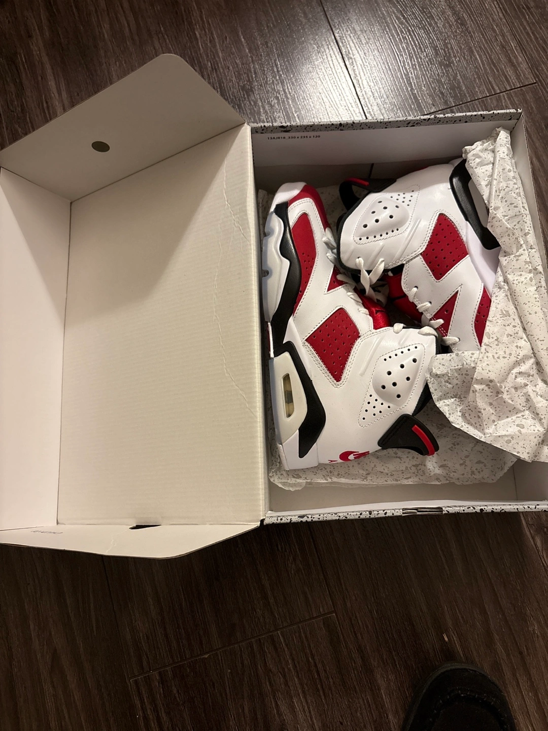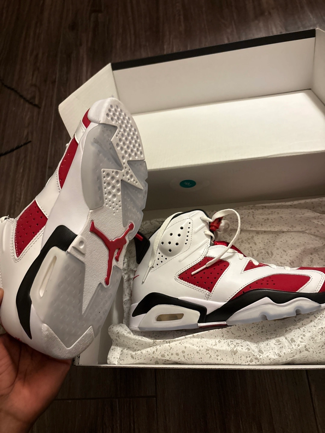 Selling a pair of Air Jordan 6 Retro Carmine sneakers in a size 7. They come with the original box. The shoes are brand new and ready for a new home!