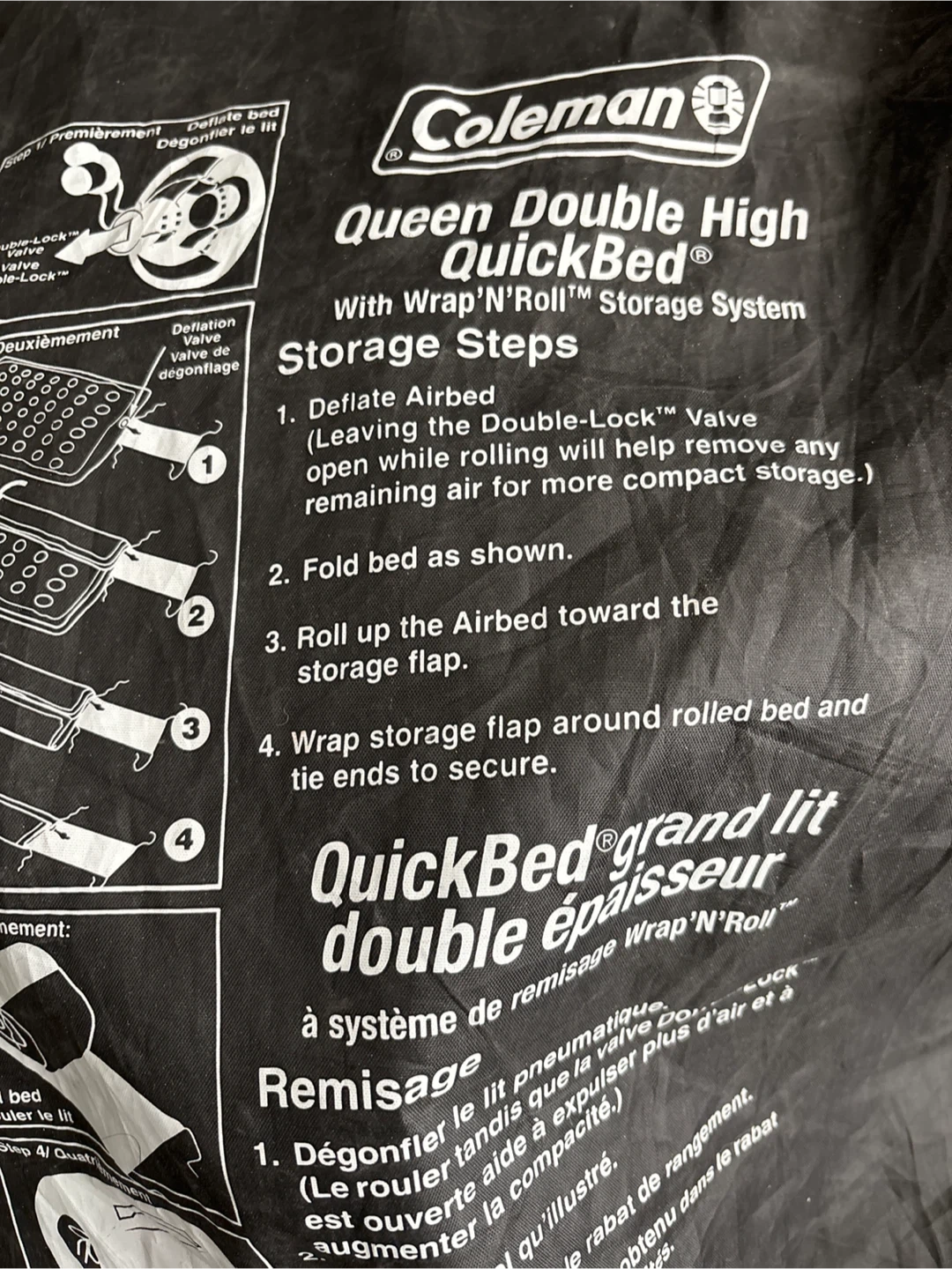 Coleman Queen Double High “Quick Bed”. Excellent condition , great for guests or camping. Rolls up into attached storage bag. Not excessively heavy. Compact when rolled up. Pump included.