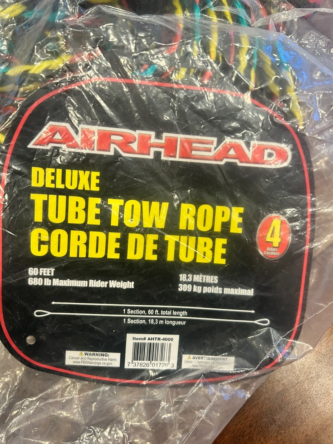 Get ready for some fun on the water with this Airhead Deluxe Tube Tow Rope! It's perfect for towing up to 4 riders. - 60 feet long - Supports up to 680 lbs (309 kg) maximum rider weight - Features a vibrant black, red, and yellow colour scheme Pickup in Ajax