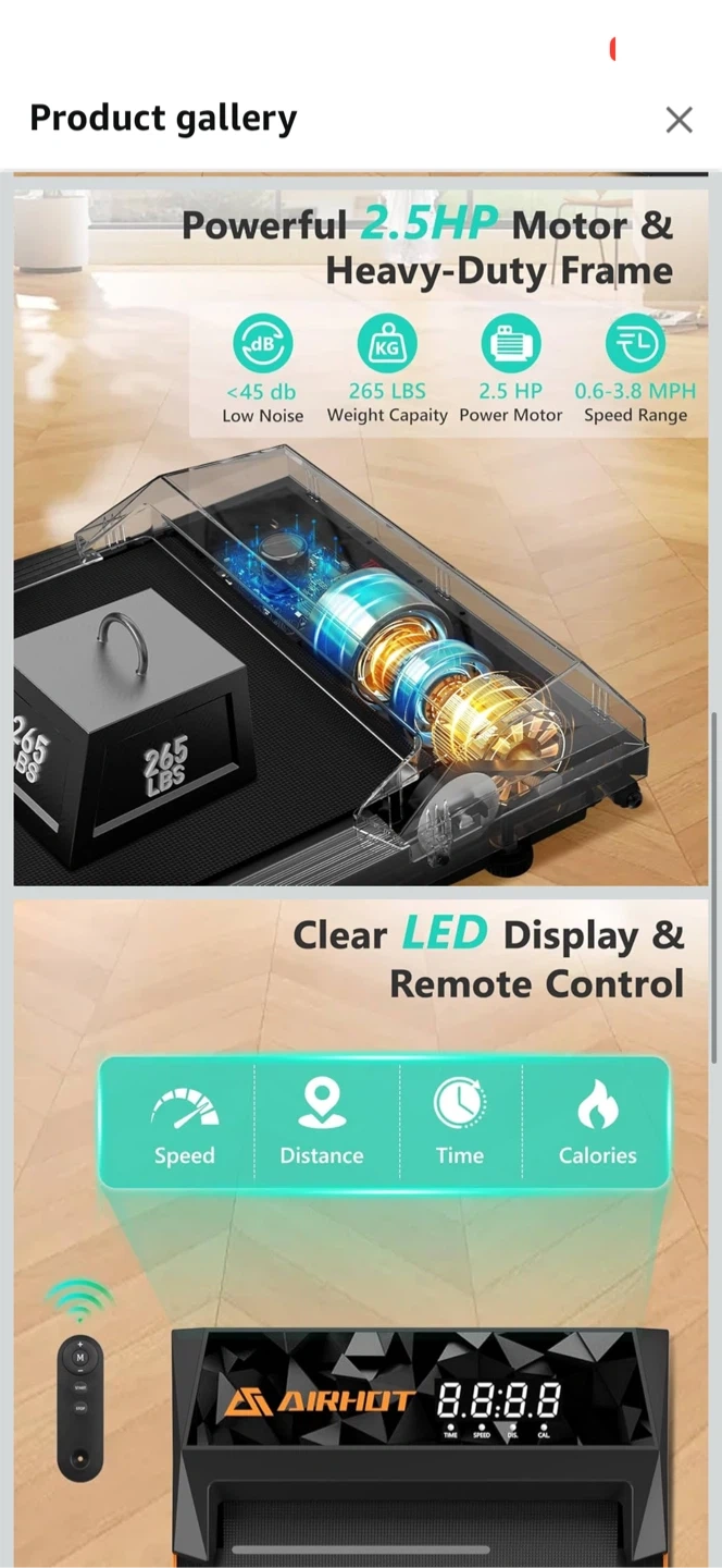 Looking to sell my AIRHOT 2 in 1 Under Desk Treadmill! It's a compact space, 2.5HP quiet desk treadmill with remote control and LED display. It's perfect for home/office use and is installation-free. It has a powerful 2.5HP motor and a heavy-duty frame, with a weight capacity of 265 lbs. It also features a clear LED display, remote control, and deep shock absorption. Comes with the original box!