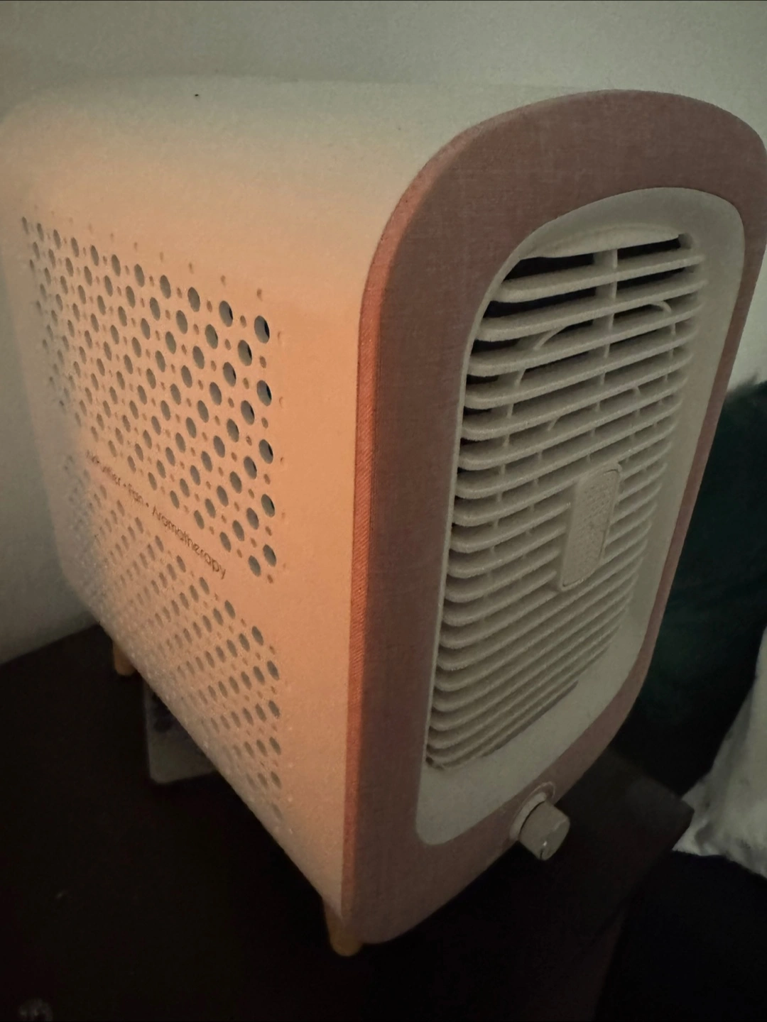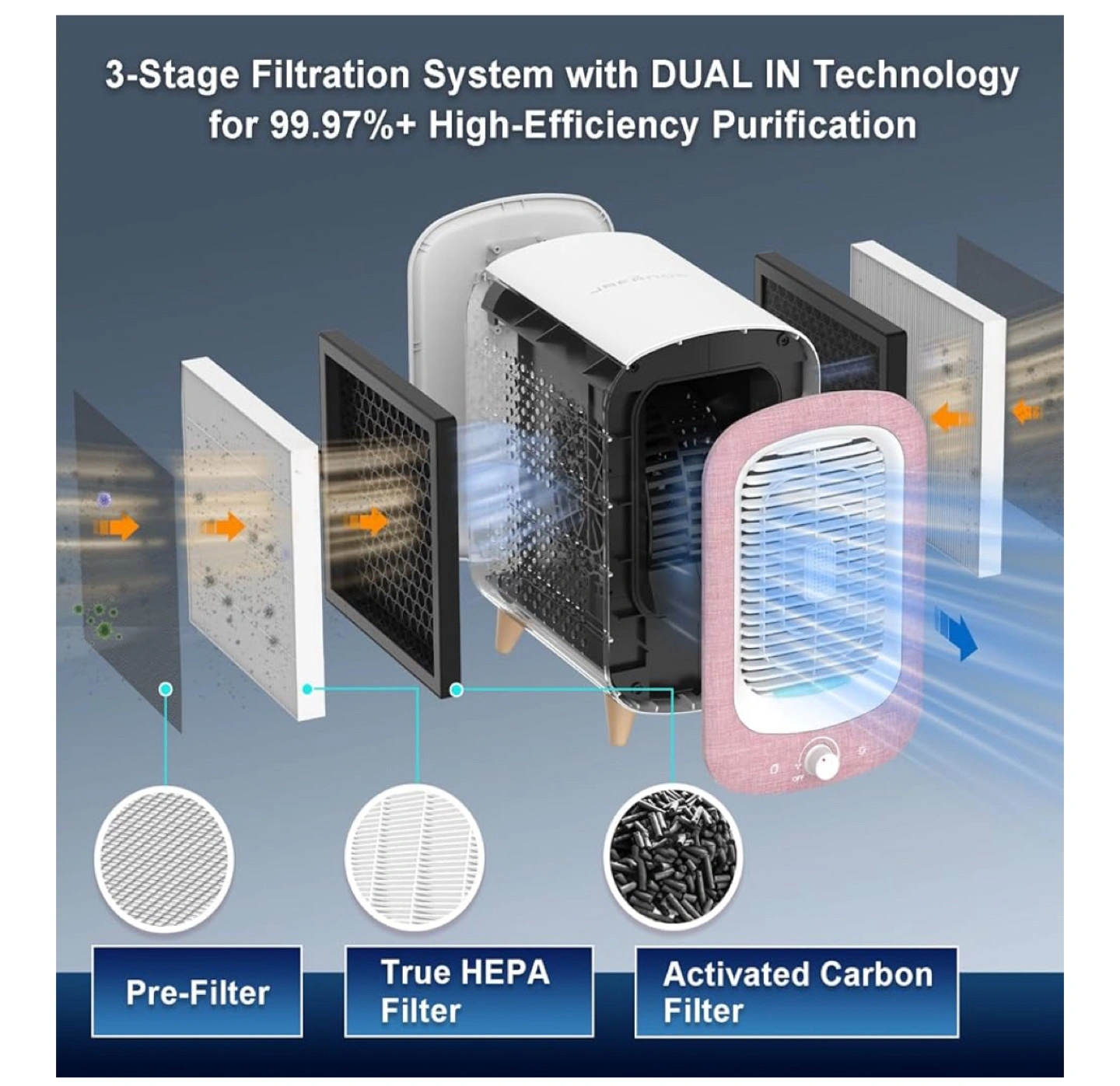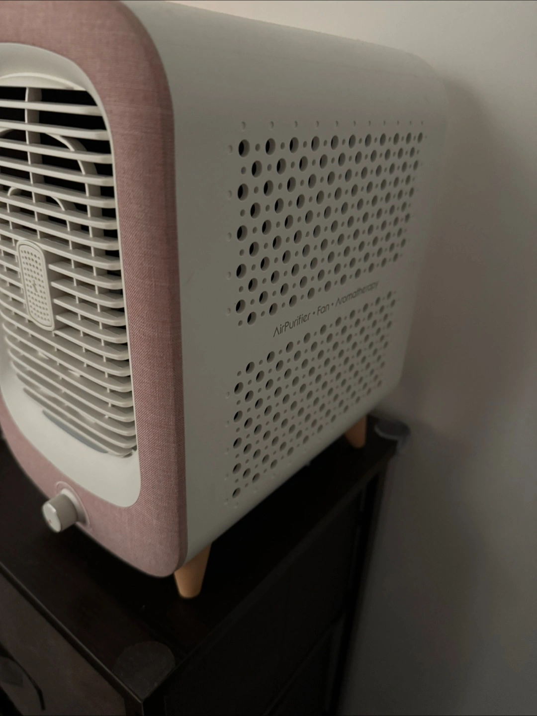 I'm selling an AirPurifier Fan with Aromatherapy feature! The unit is pink and has a 3-Stage Filtration System with DUAL IN Technology for 99.97%+ High-Efficiency Purification. It includes a Pre-Filter, True HEPA Filter, and Activated Carbon Filter