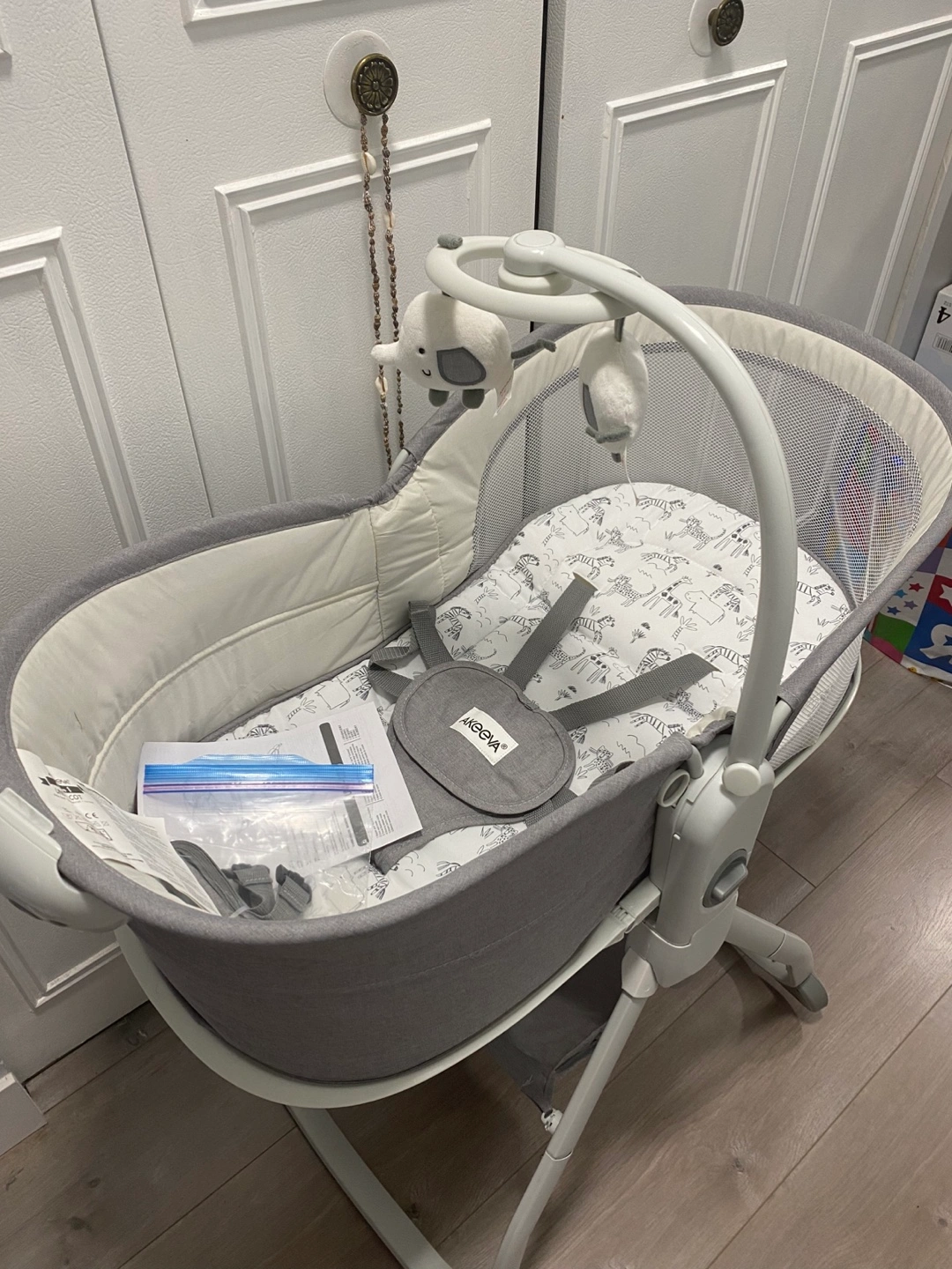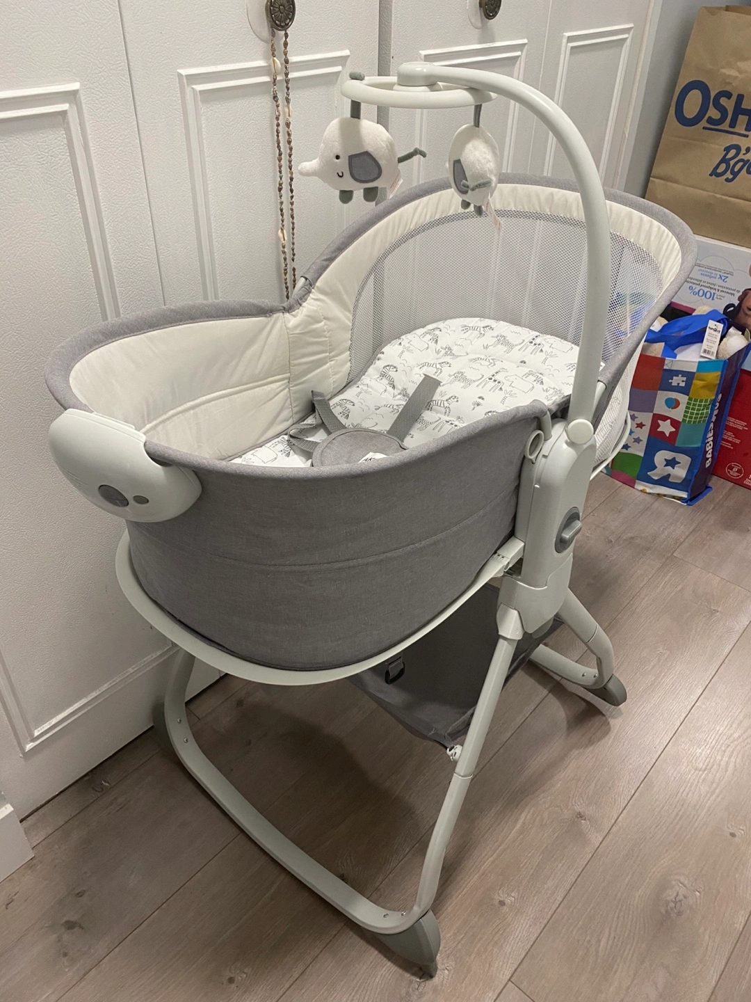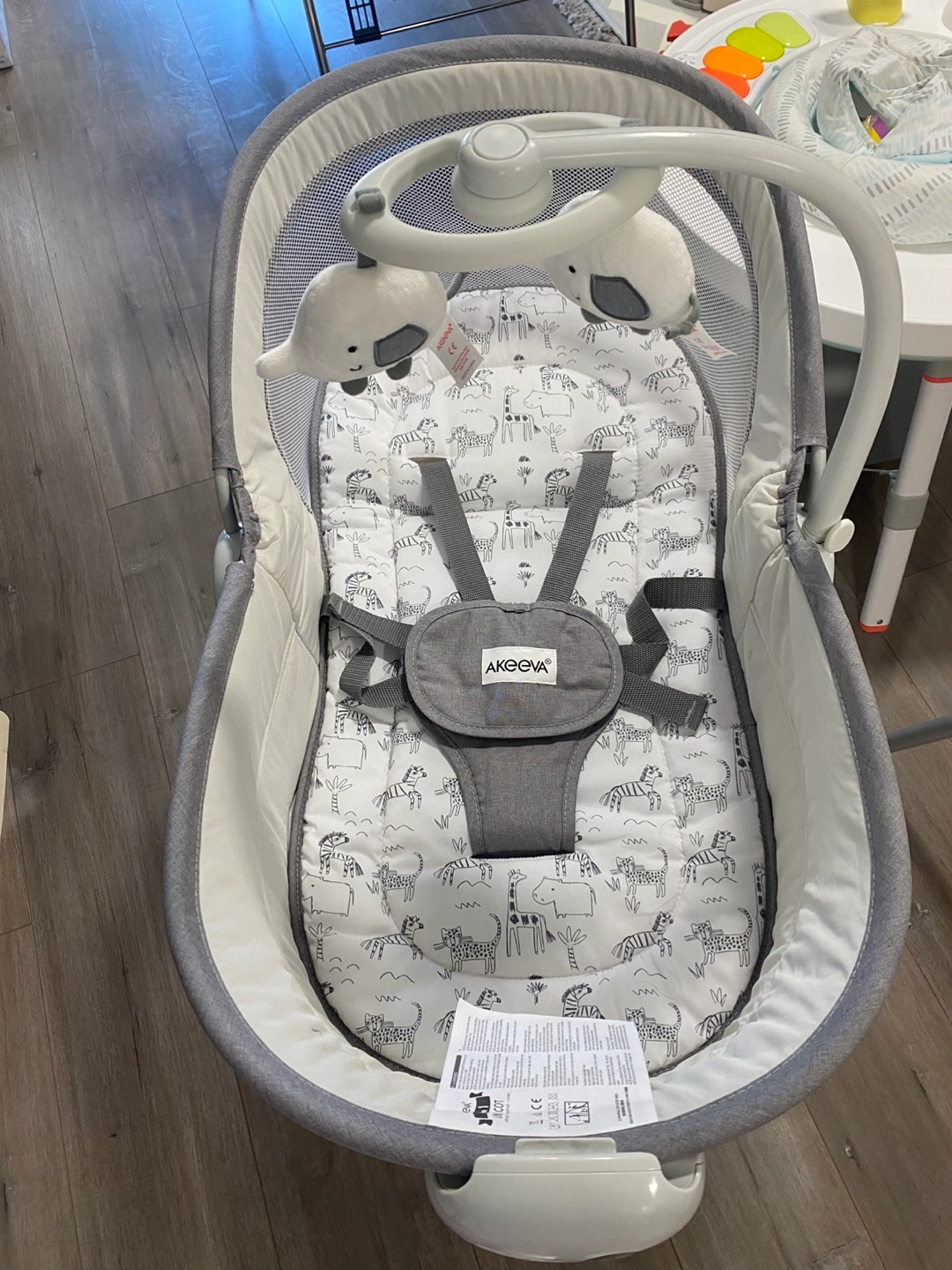 Selling a gently used Akeeva 6in1 baby bassinet. It's in great condition and ready for a new little one! It features napper and rock & play modes, a cozy seat mode, travel bassinet mode, rocking sleeper mode, dream centre mode, and bedside bassinet mode.