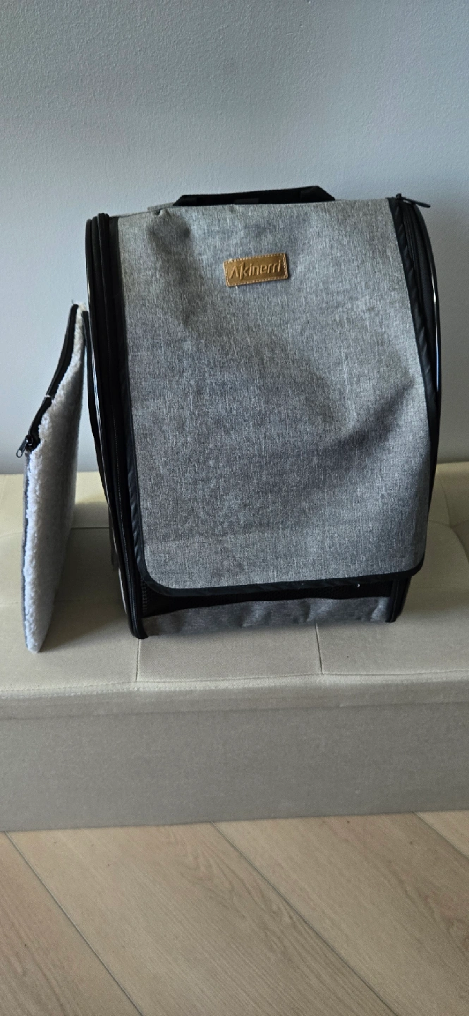 Looking to sell a Kinerd pet carrier backpack. It's grey and comes with wheels for easy transport. Great for taking your furry friend on trips or to the vet! can be used with or without weeks. used for a year, with a dog (Yorkie). washable pad, has zipper for easy access to wash.