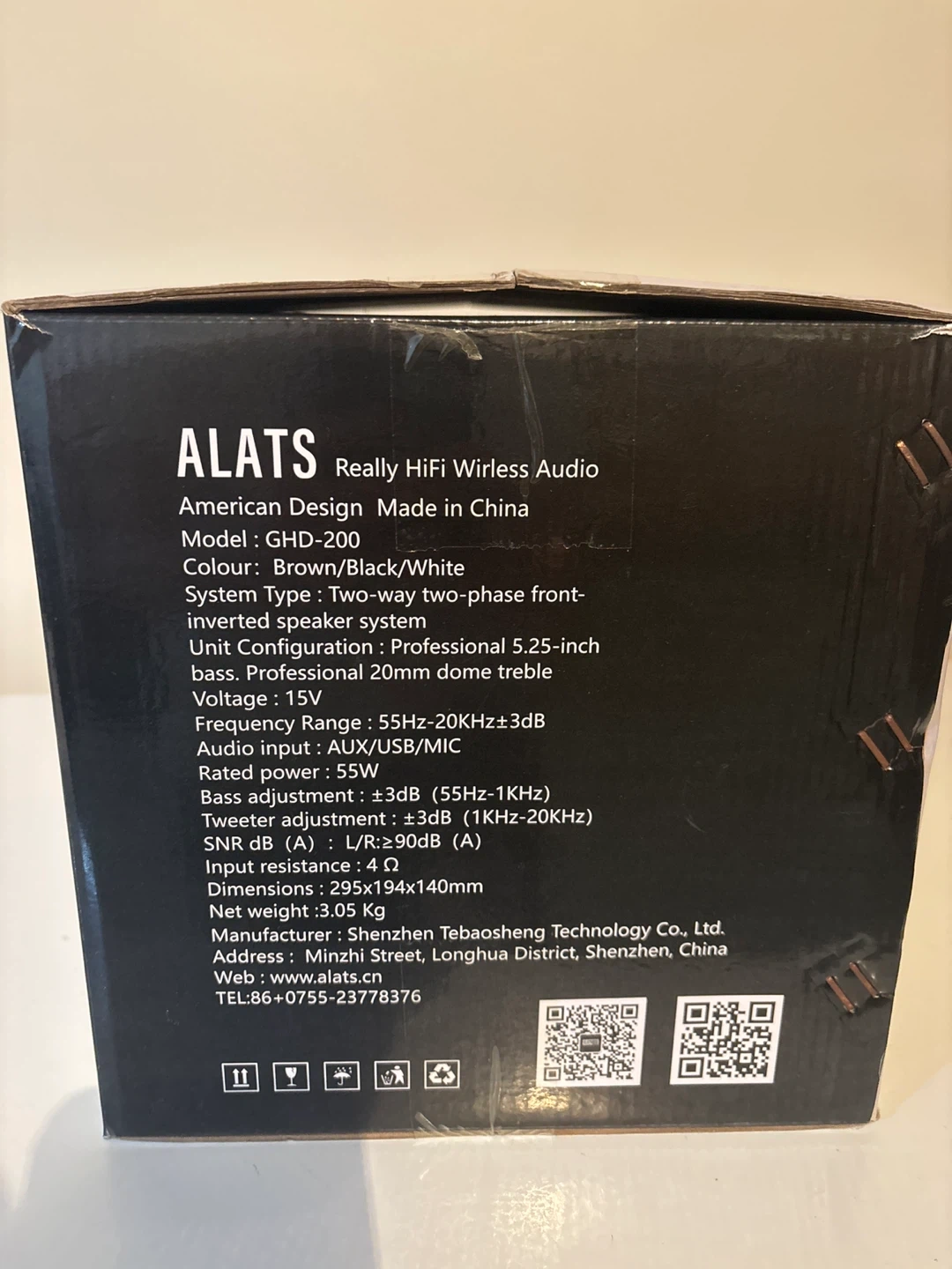 Selling a brand new ALATS Really Hifi Wireless Audio system! It's the GHD-200 model and comes in a stylish brown/black/white colour scheme. Key features: - Two-way two-phase front-inverted speaker system - Professional 5.25-inch bass - 20mm dome treble - AUX/USB/MIC audio input - Dimensions: 295x194x140mm Comes with the original box and all included components