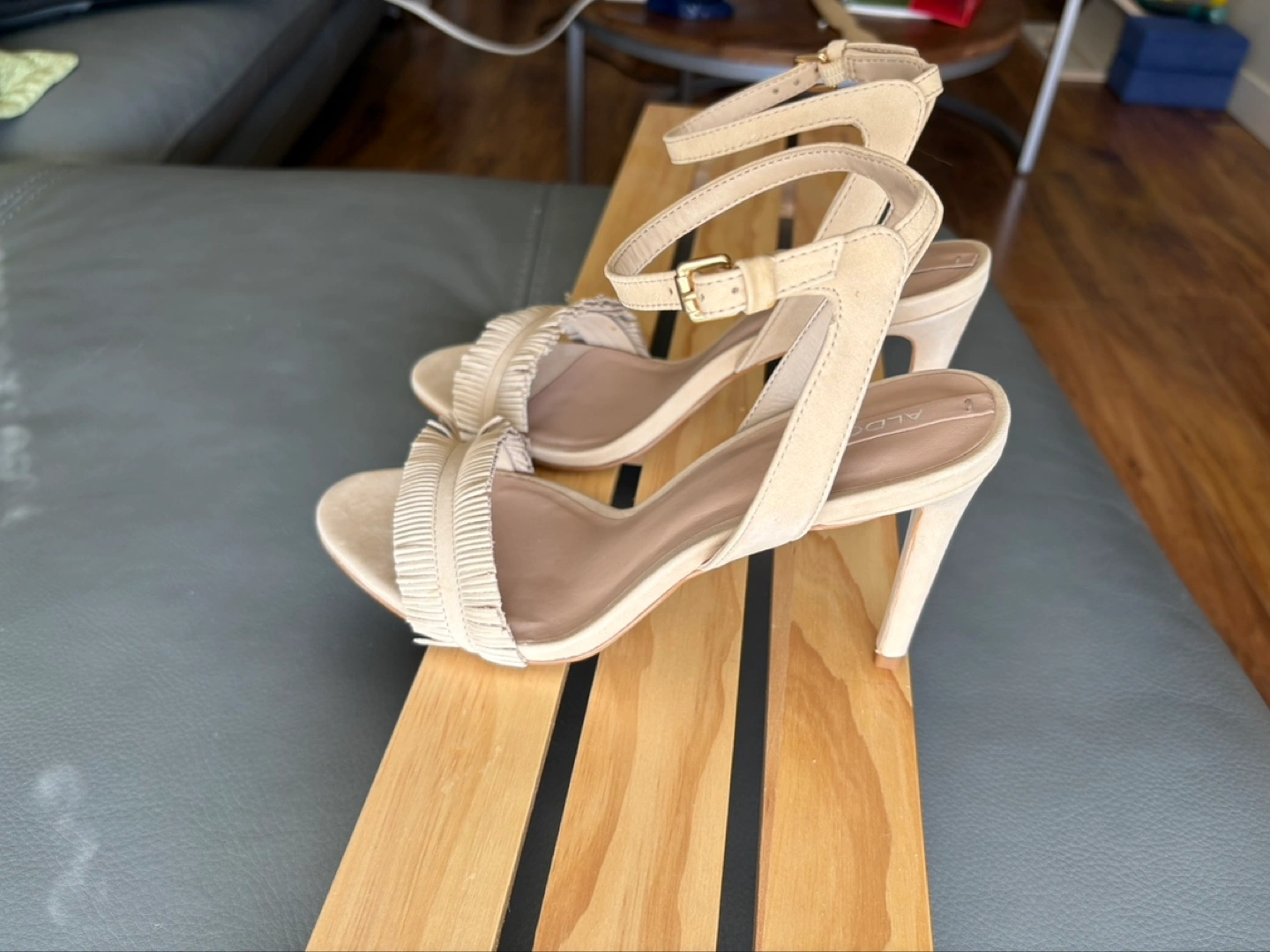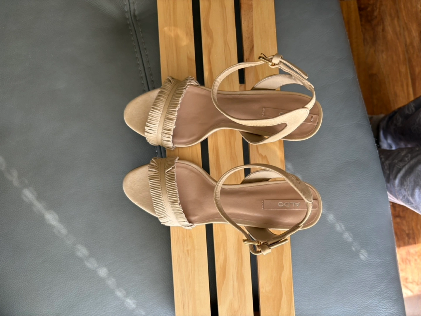 Beautiful beige suede heels. Fringe detail. Ankle strap closure. High heels. Great for summer events.
