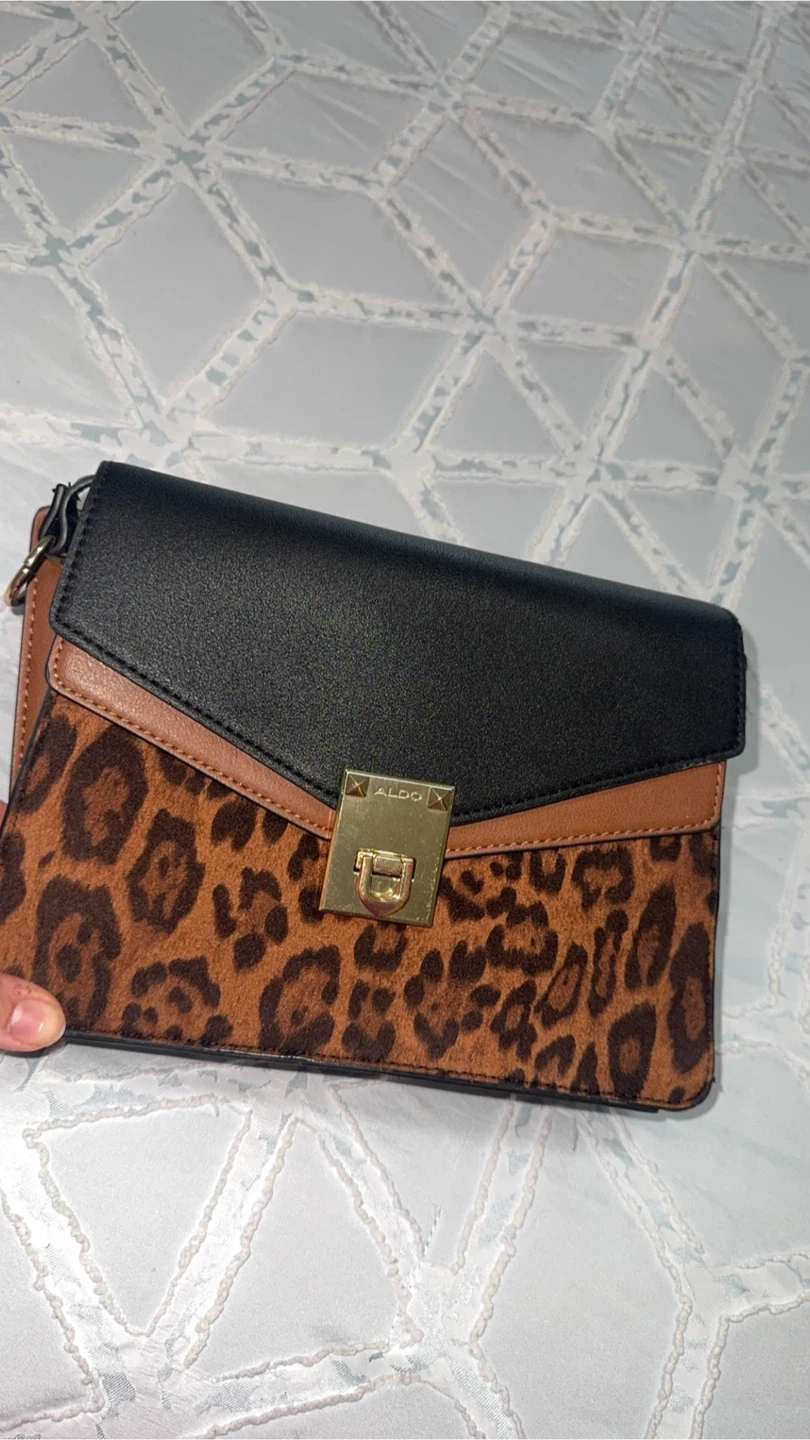 Selling an ALDO crossbody bag with a unique leopard print design! It features a black and brown colour scheme. Perfect for adding a stylish touch to any outfit!