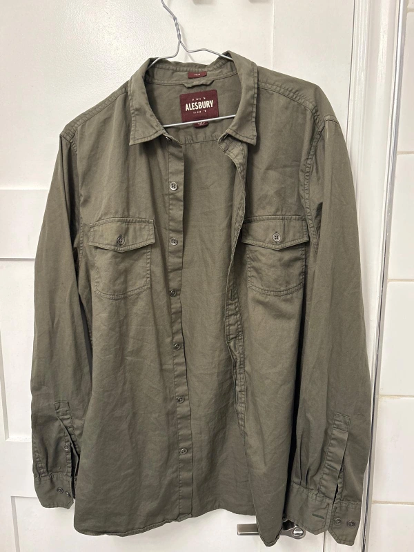 Selling an Alesbury shirt in olive green! It's a size XL and appears to be in good condition. Perfect for a casual look or layering. Feel free to ask any questions!