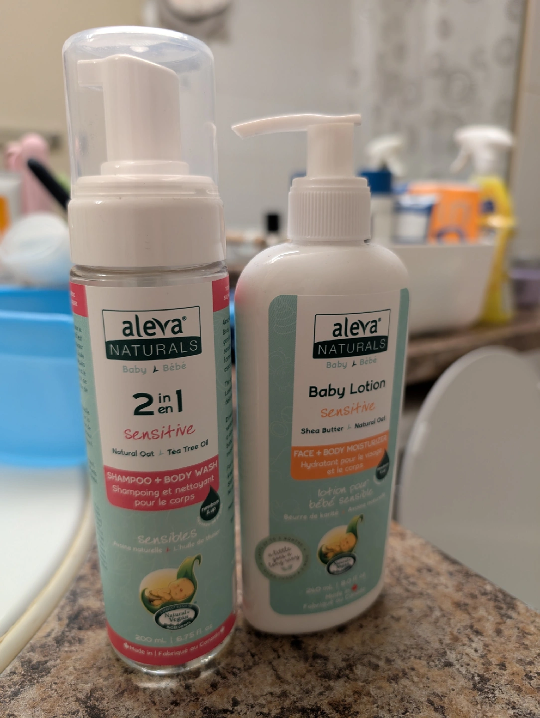 Selling a set of Aleva Naturals baby products! You'll get a 2-in-1 shampoo and body wash, plus a baby lotion. Both are designed for sensitive skin with natural oat and shea butter. The shampoo also includes tea tree oil. Perfect for newborns and up!