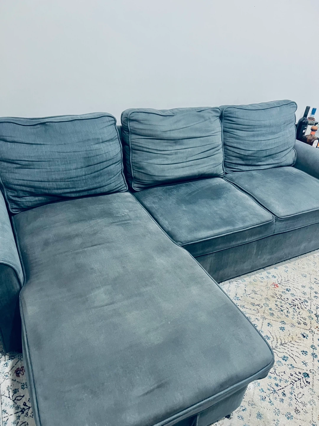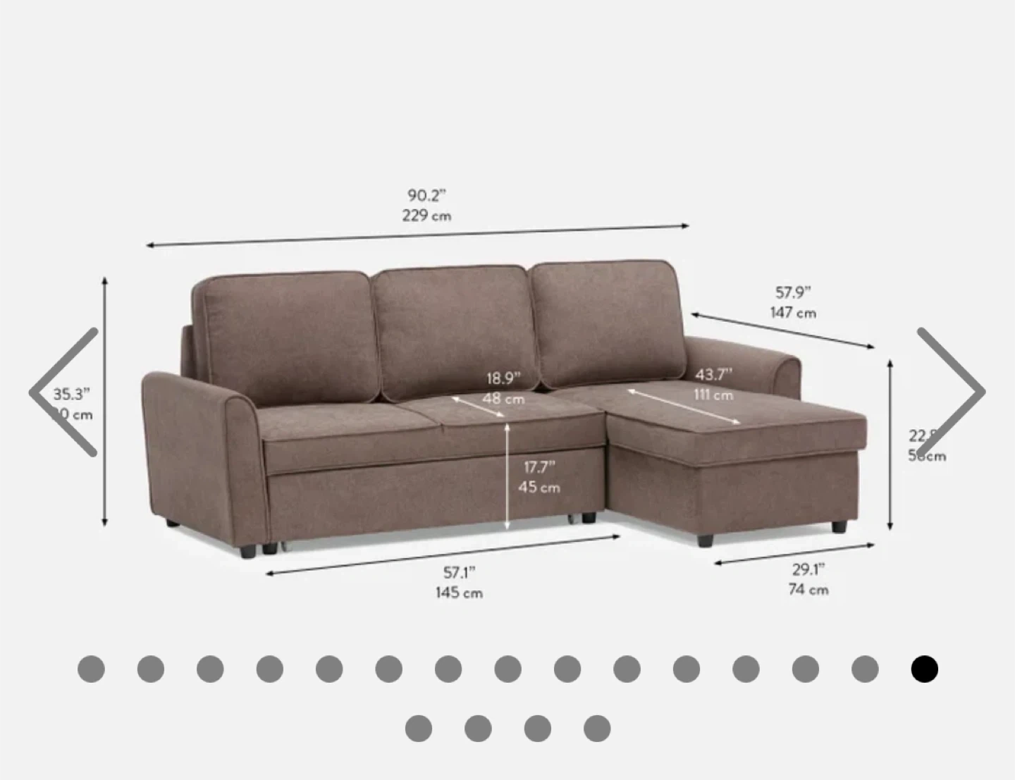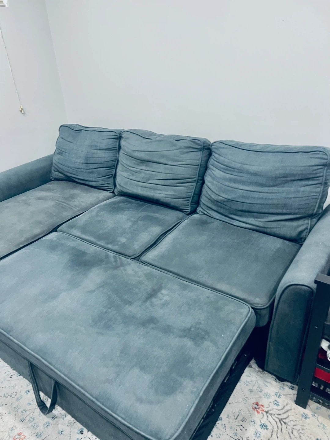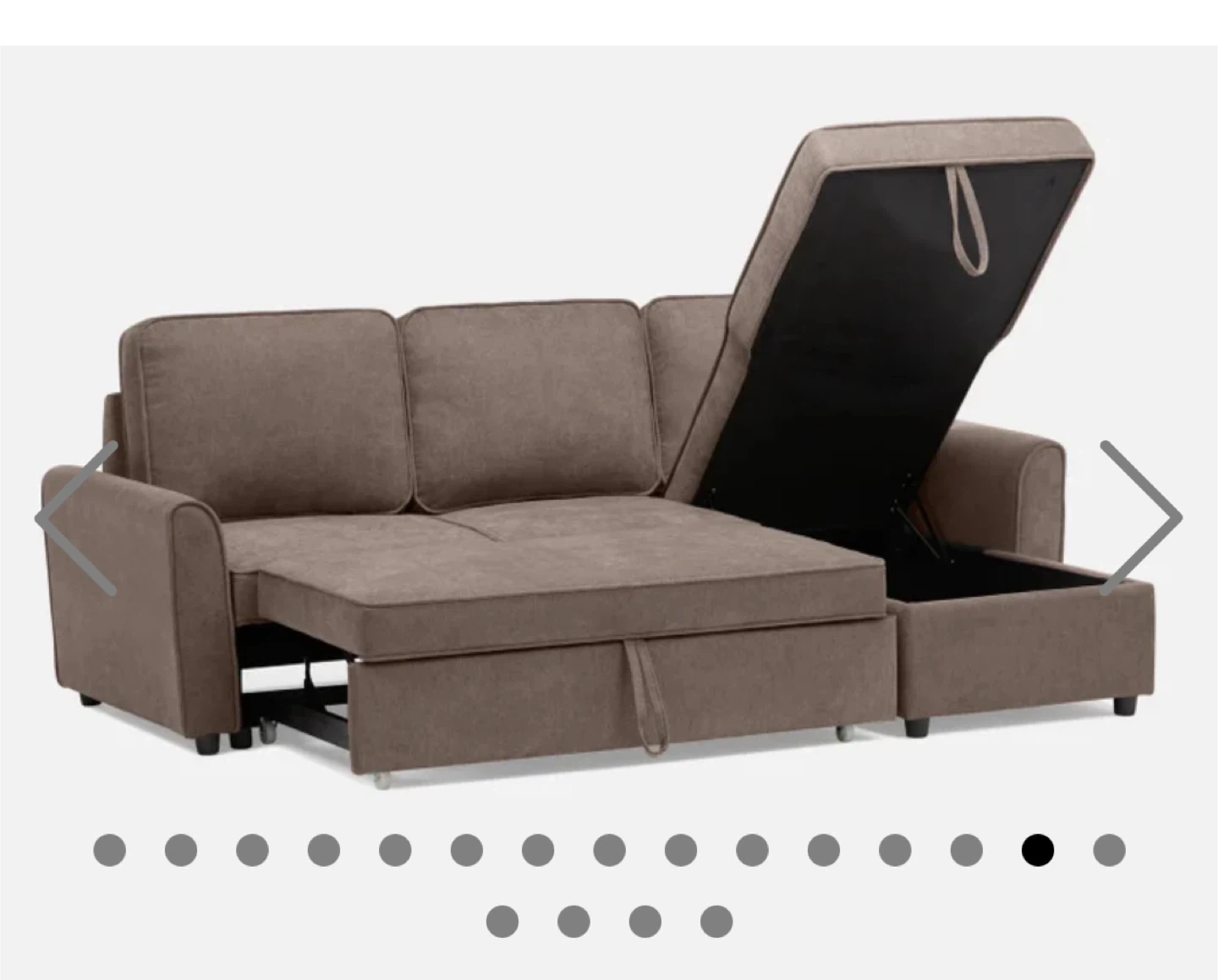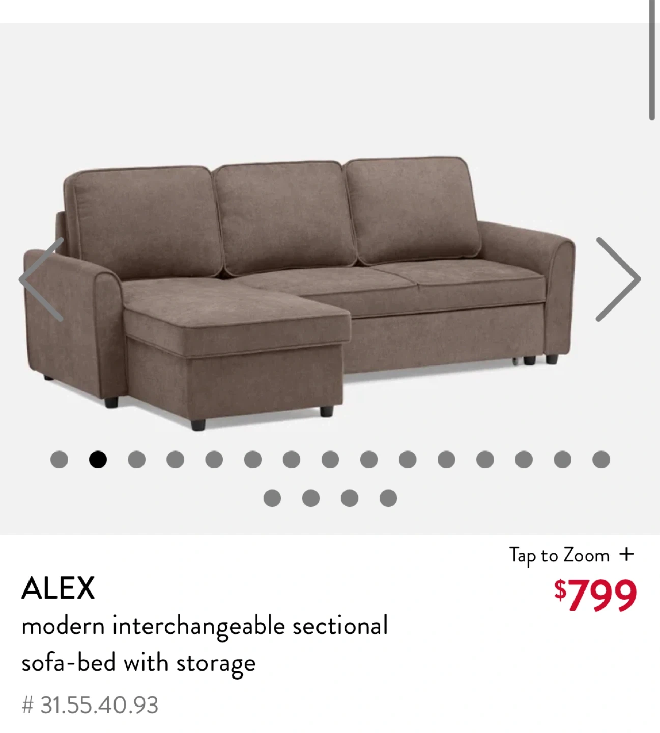 Selling an ALEX modern interchangeable sectional sofa-bed with storage. It's in good condition and has a handy storage compartment. Dimensions are approximately 90.2" x 57.9" x 35.3". Originally bought for $799!