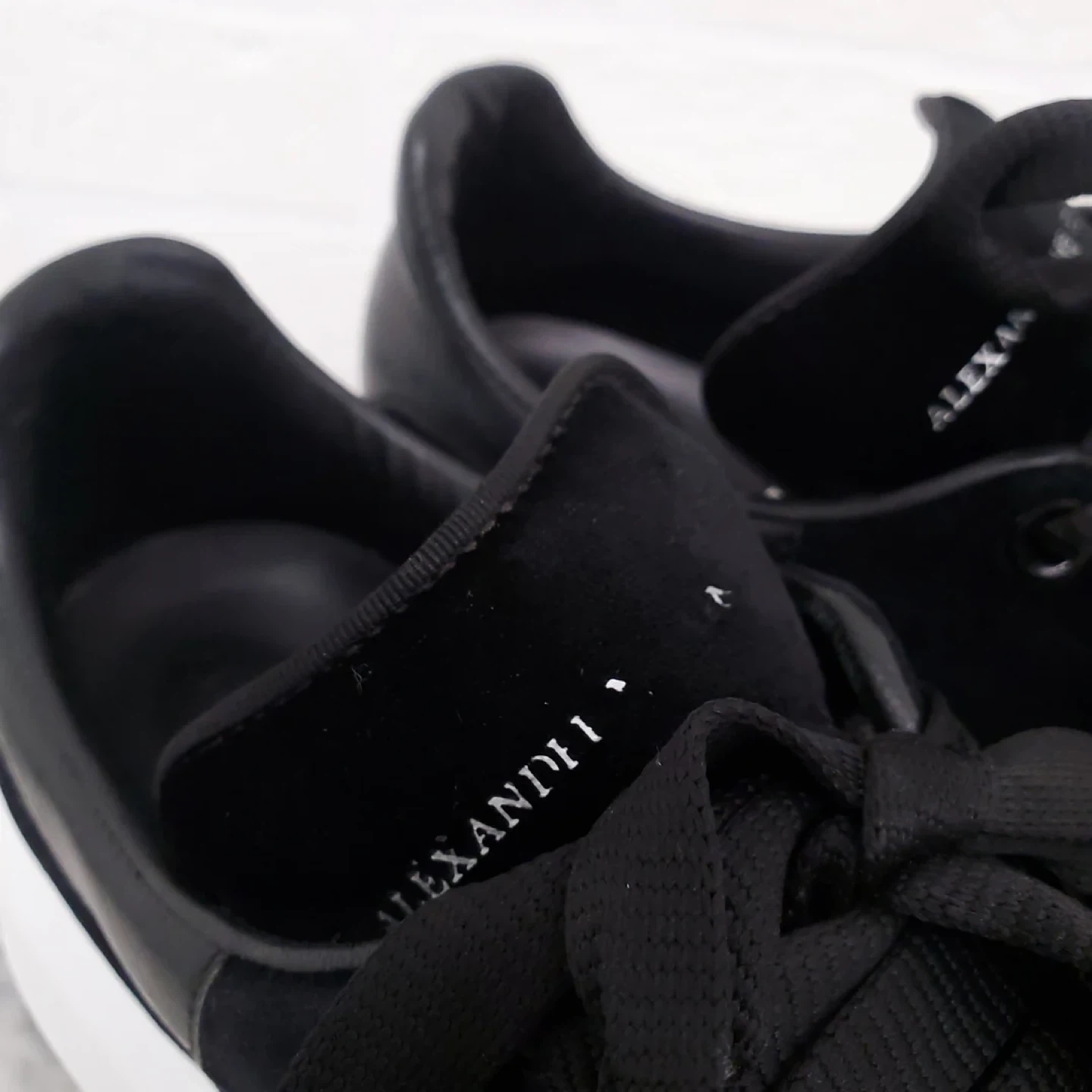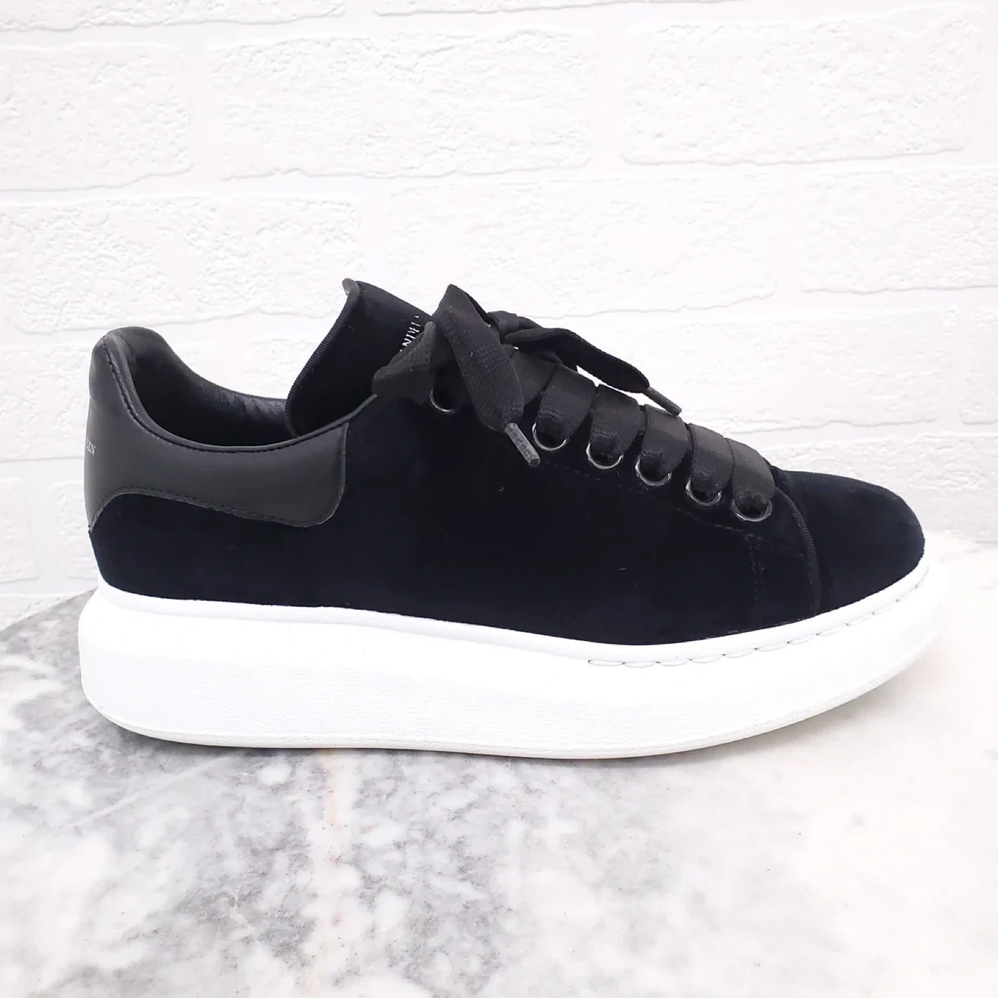 Alexander McQueen. Only worn twice. Almost new with defect. The lettering is slightly rubbed off but can't tell when they are laced up. Black smooth velvet lace-up sneaker with rounded toe. Large flat laces and McQueen signature on tongue and heel counter. Oversized rubber sole.