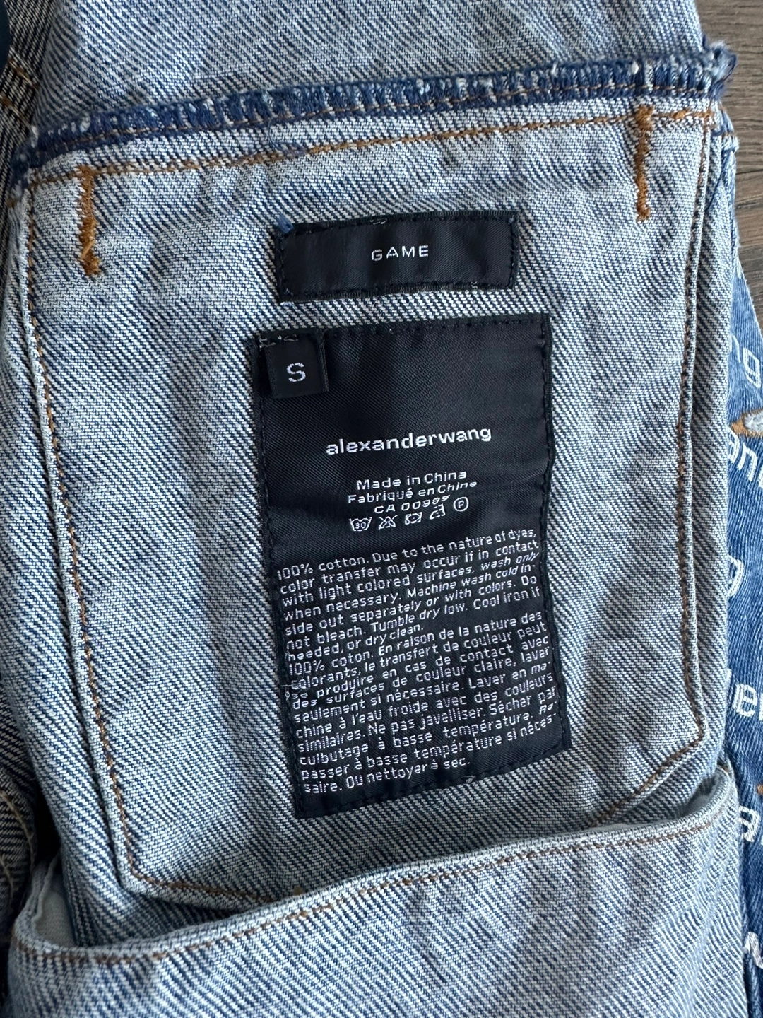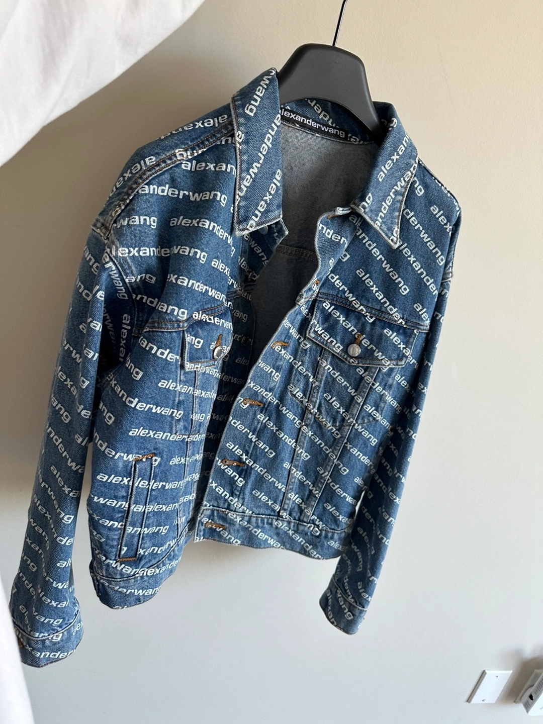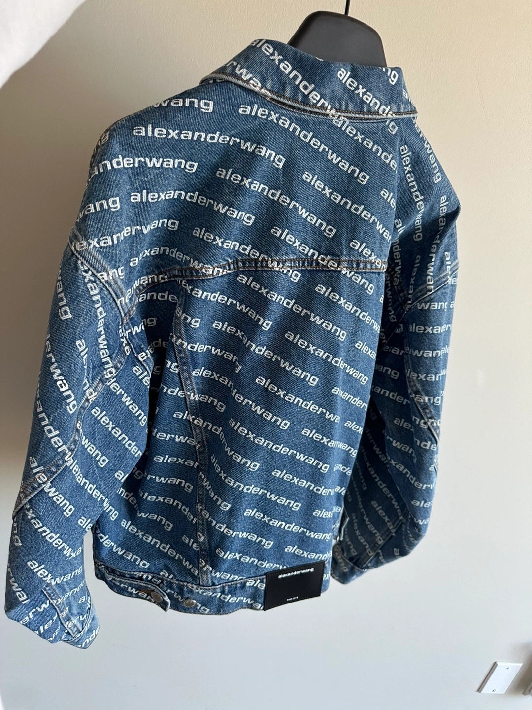 Blue denim jacket. All-over Alexander Wang logo print. Size small.