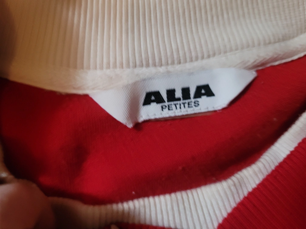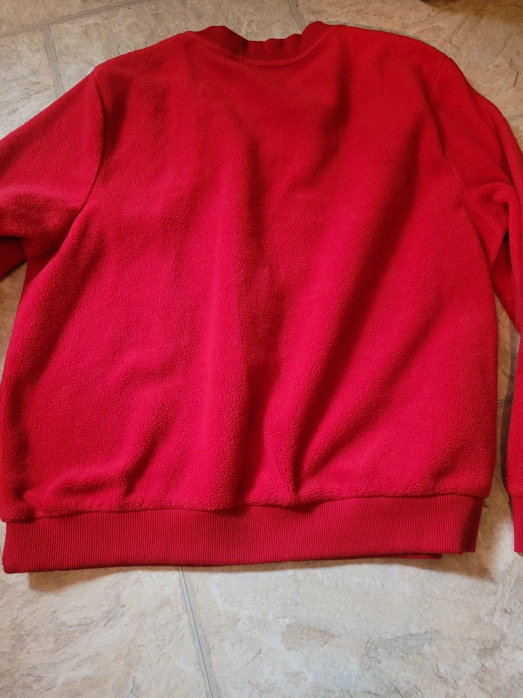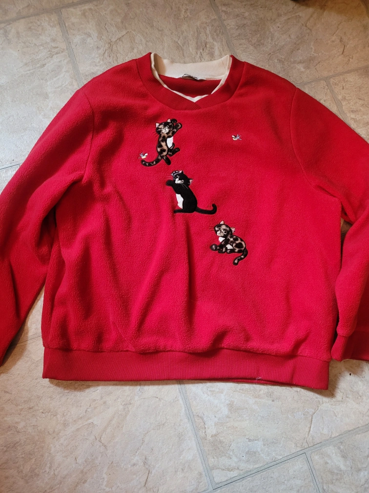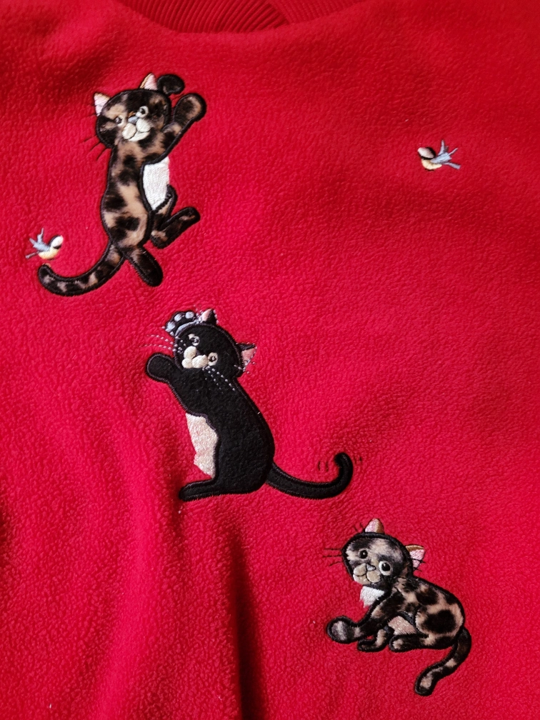 Cozy up with this adorable Alia Petites crewneck! It's a vibrant red fleece featuring cute cat embroidery. Perfect for a casual and comfy look!