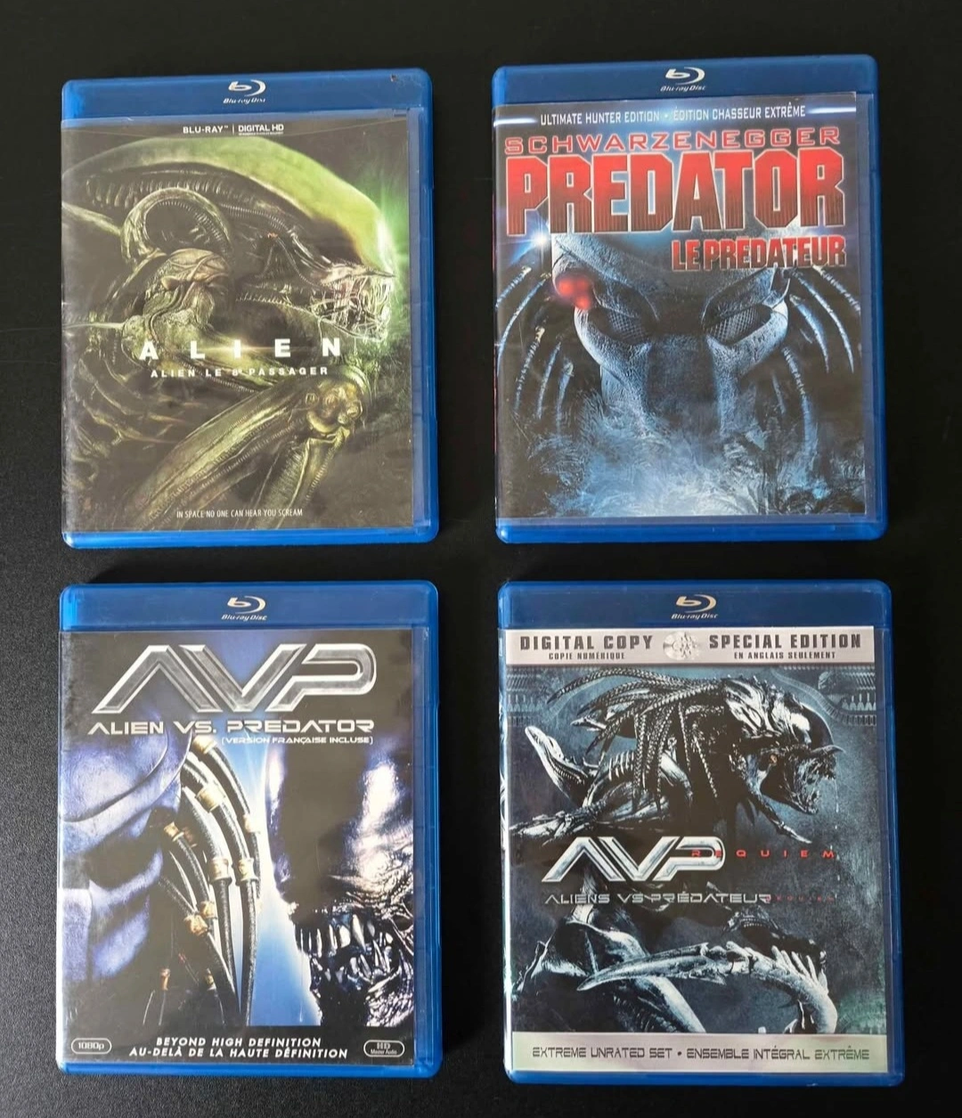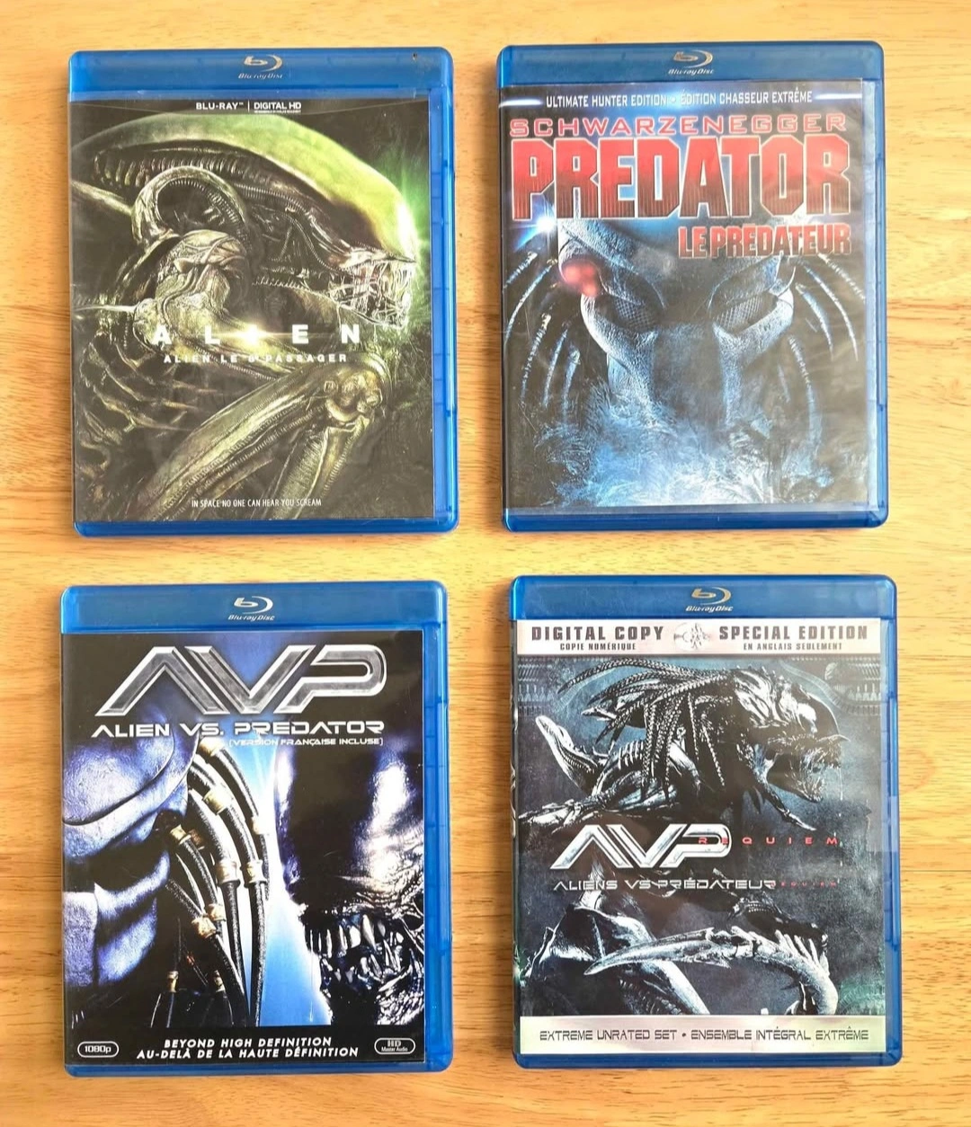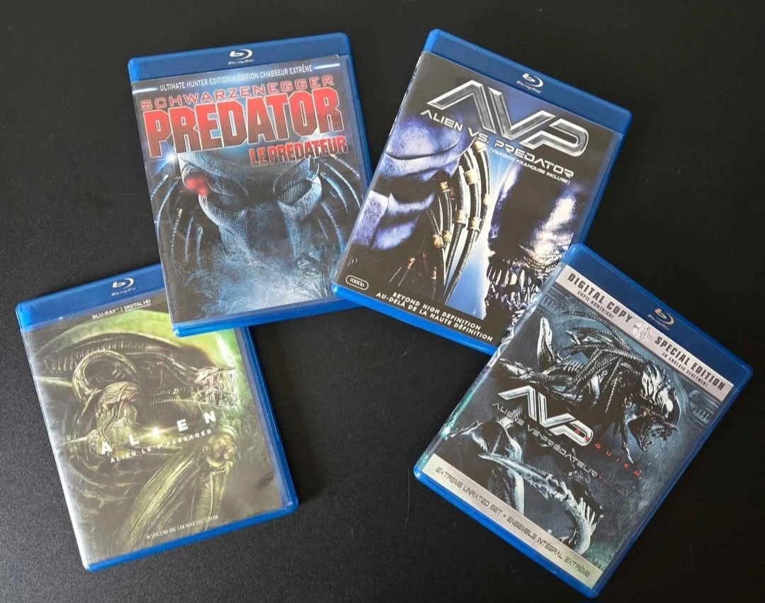 Alien + Predator Blu-ray Lot This lot consists of 4 movies, all gently used, cases in tact and disks in mint condition, with no scratches. The first chilling chapters of the alien and the predator sagas: 1. Alien - 1979 science fiction horror film 2. Predator - 1987 science fiction action film ...AND then jumping right into the intense battle scenes between the two extraterrestrial species! 3. Alien vs.Predator - 2004 science fiction action horror 4. Alien vs Predator Requiem - 2007 science fiction horror action film. The second installment in the "Alien vs. Predator" franchise. $5 each OR All 4 for $15 Cash is preferable. Exact payment Only (No change) EMTs welcome. PICKUP Only, Weston area. Comes from a clean, bug free, smoke free, kitty friendly home. Willing to meet curbside.