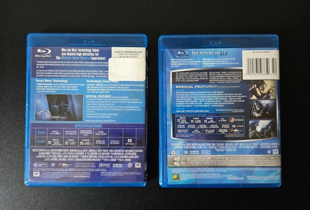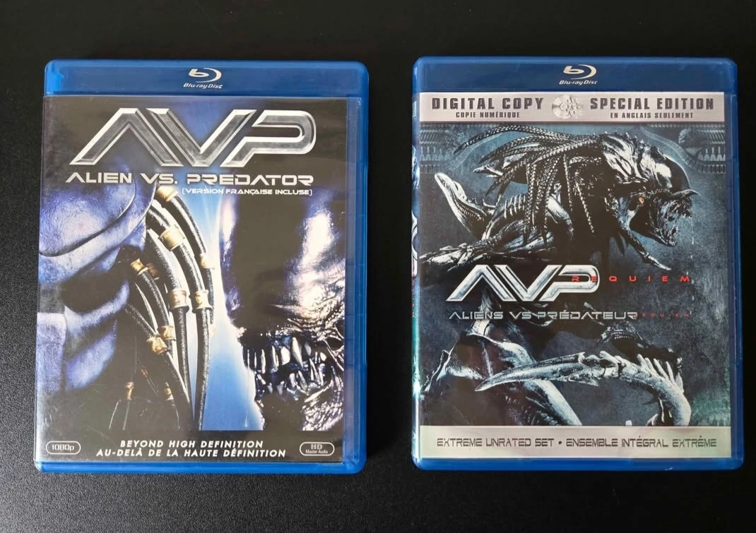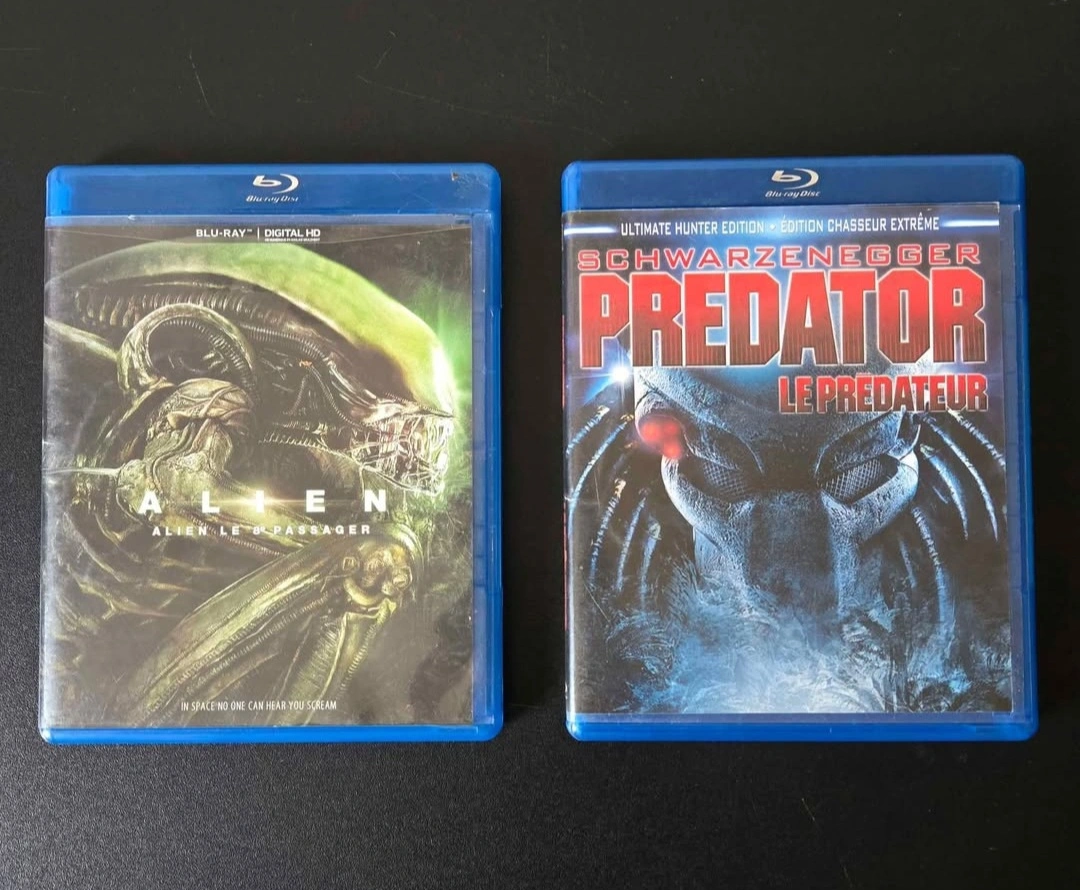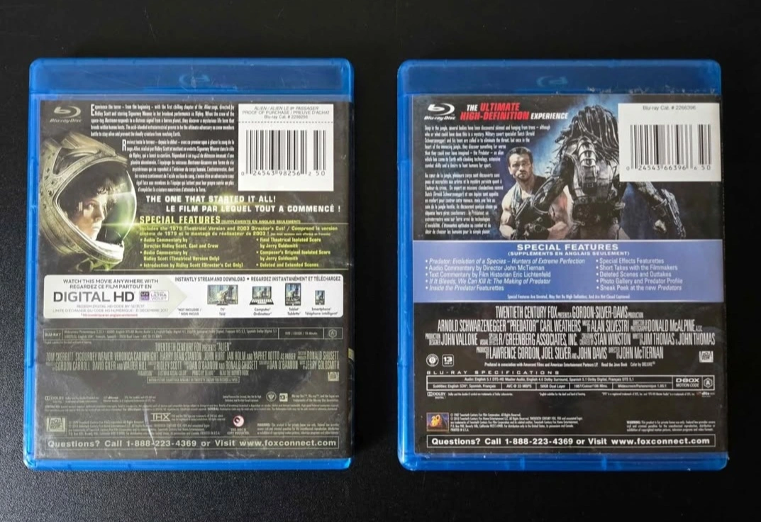 Alien + Predator Blu-ray Lot This lot consists of 4 movies, all gently used, cases in tact and disks in mint condition, with no scratches. The first chilling chapters of the alien and the predator sagas: 1. Alien - 1979 science fiction horror film 2. Predator - 1987 science fiction action film ...AND then jumping right into the intense battle scenes between the two extraterrestrial species! 3. Alien vs.Predator - 2004 science fiction action horror 4. Alien vs Predator Requiem - 2007 science fiction horror action film. The second installment in the "Alien vs. Predator" franchise. $5 each OR All 4 for $15 Cash is preferable. Exact payment Only (No change) EMTs welcome. PICKUP Only, Weston area. Comes from a clean, bug free, smoke free, kitty friendly home. Willing to meet curbside.
