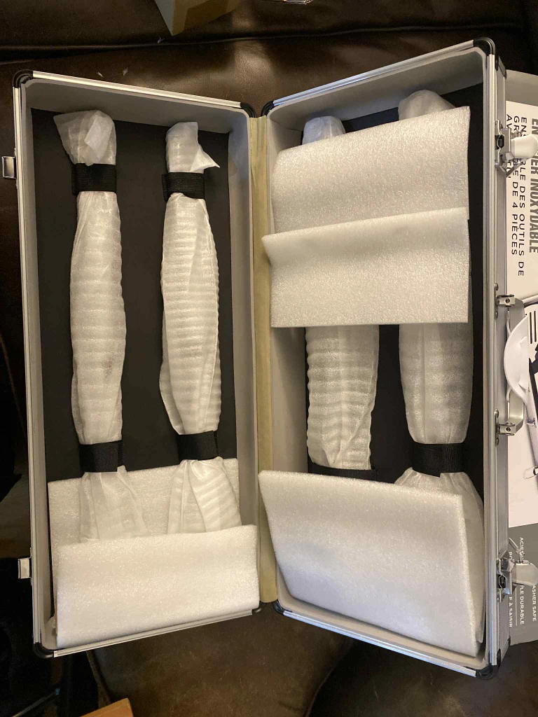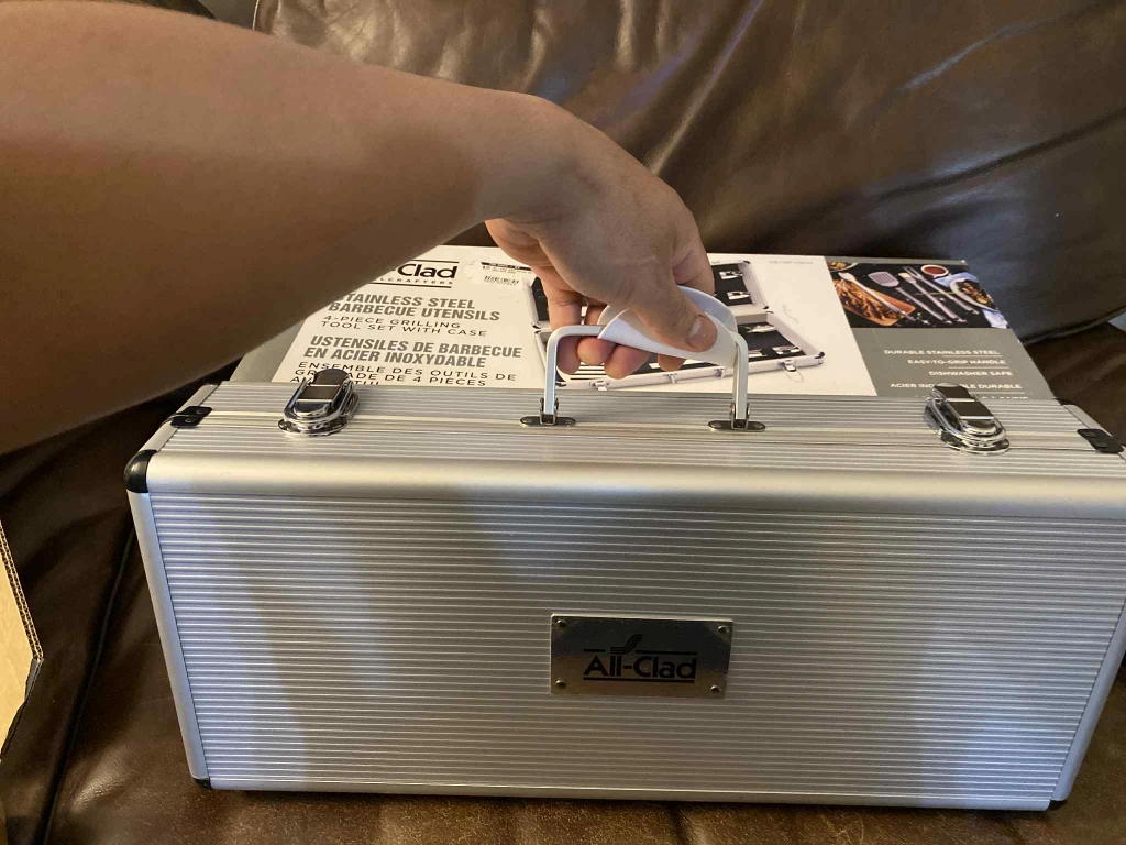 Selling a brand new All-Clad stainless steel barbecue utensil set in a case. It includes 4 pieces for all your grilling needs. Also including a unique Tenmokus bowl, still in its original packaging and box!