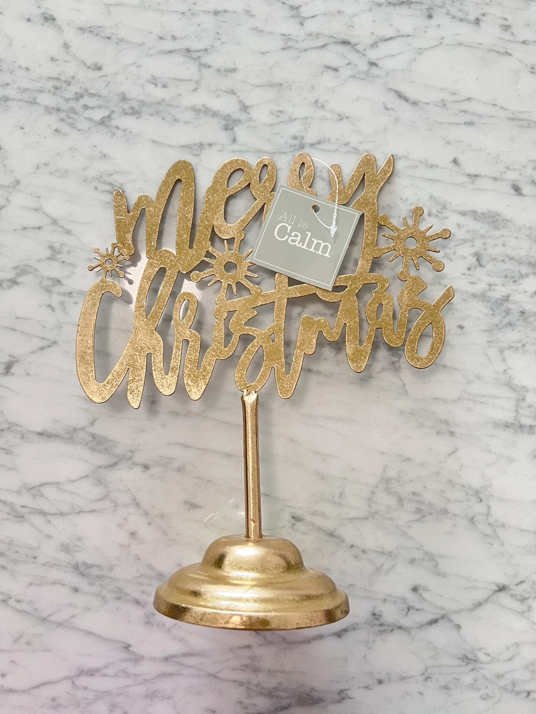 Add a touch of holiday cheer to your home with this Merry Christmas tabletop decor! It features a gold finish and stands approximately 9 inches tall. Perfect for adding a festive touch to any room during the holiday season