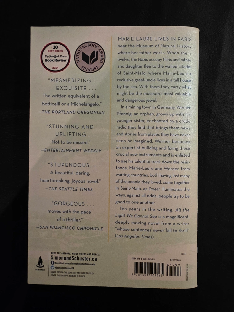 Selling a copy of "All the Light We Cannot See" by Anthony Doerr. It's a novel and a Globe and Mail bestseller. A beautiful and moving story!