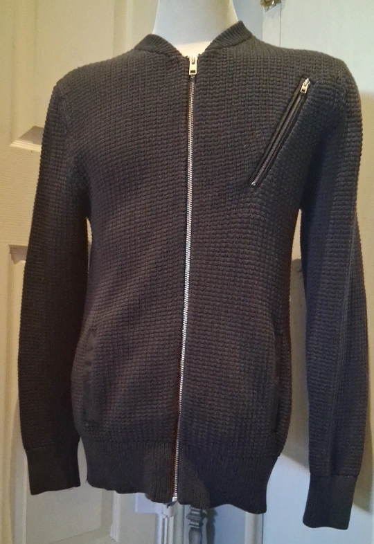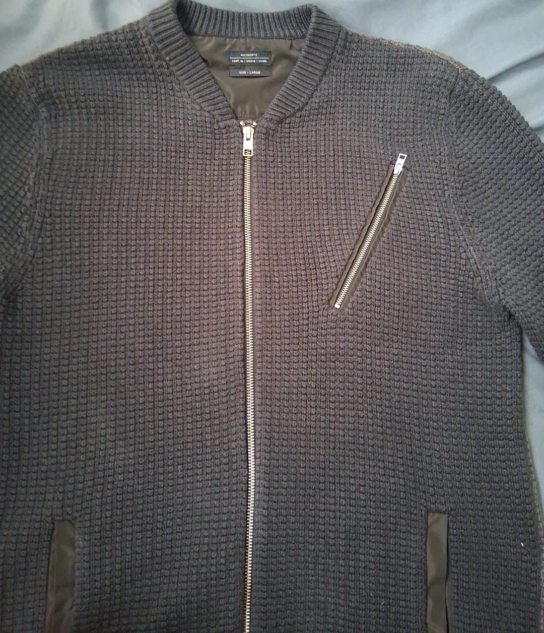 Here's a stylish AllSaints zip-up cardigan in size large. It has a unique design with a zipper detail on the chest. Great for layering or wearing on its own!