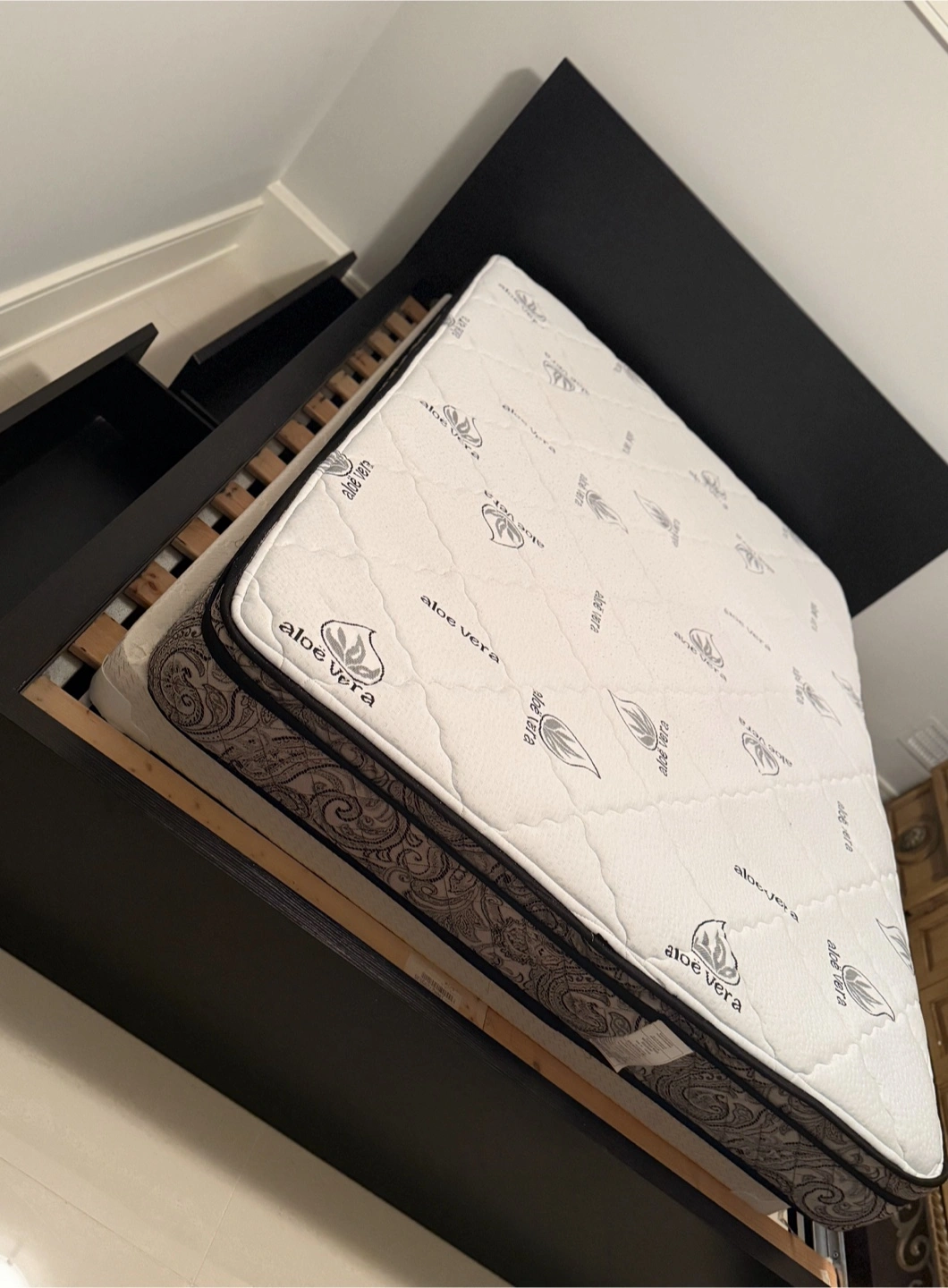 Selling an Aloe Vera mattress! It's in good condition and ready for a new home. It features a white top with aloe vera leaf designs and a patterned border. Perfect for a comfy night's sleep!