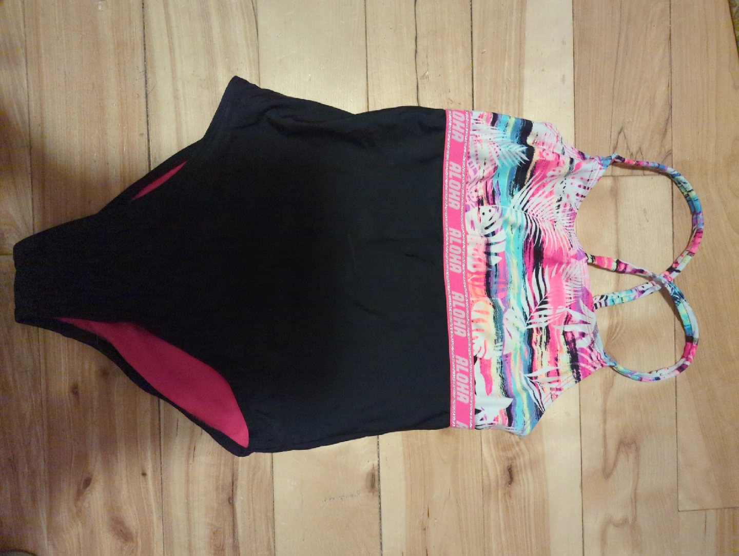 Selling a cute one-piece swimsuit with an 'Aloha' design around the top. It's black with pink accents.