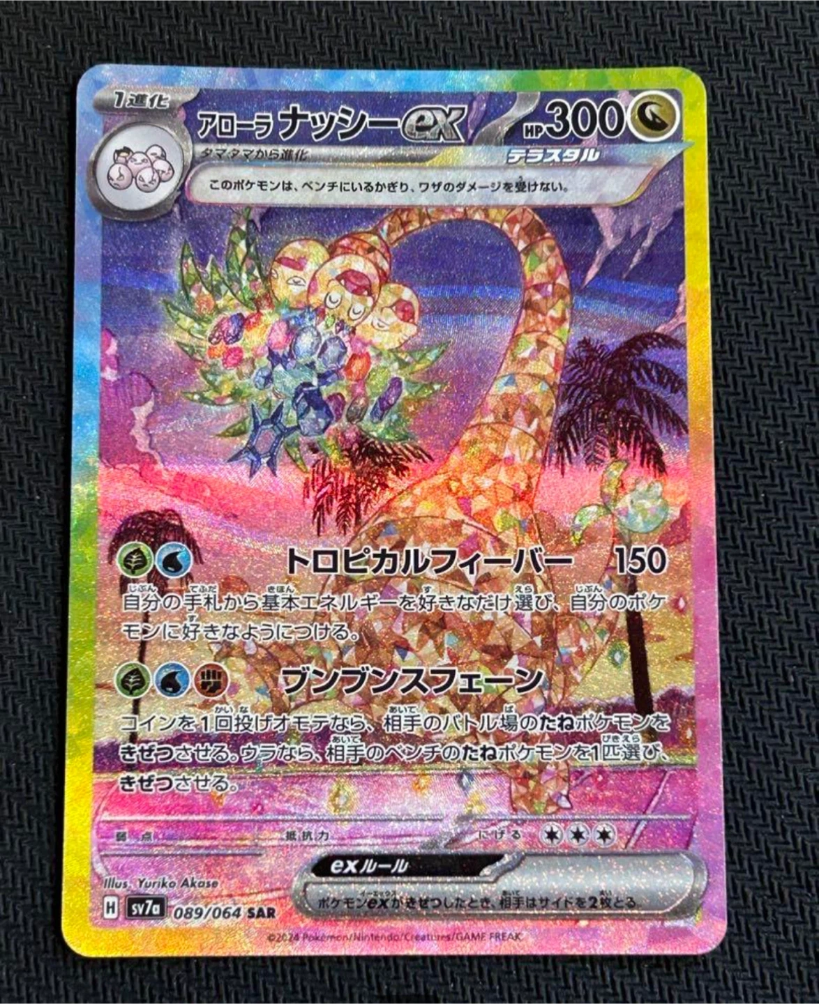 Selling an Alolan Exeggutor ex Pokemon card! It has a Tropical Fever attack with 150 damage and a ability called Boom Boom Spore. The card is from 2024, illustrated by Yuriko Akase, and has the card number 089/064 SAR