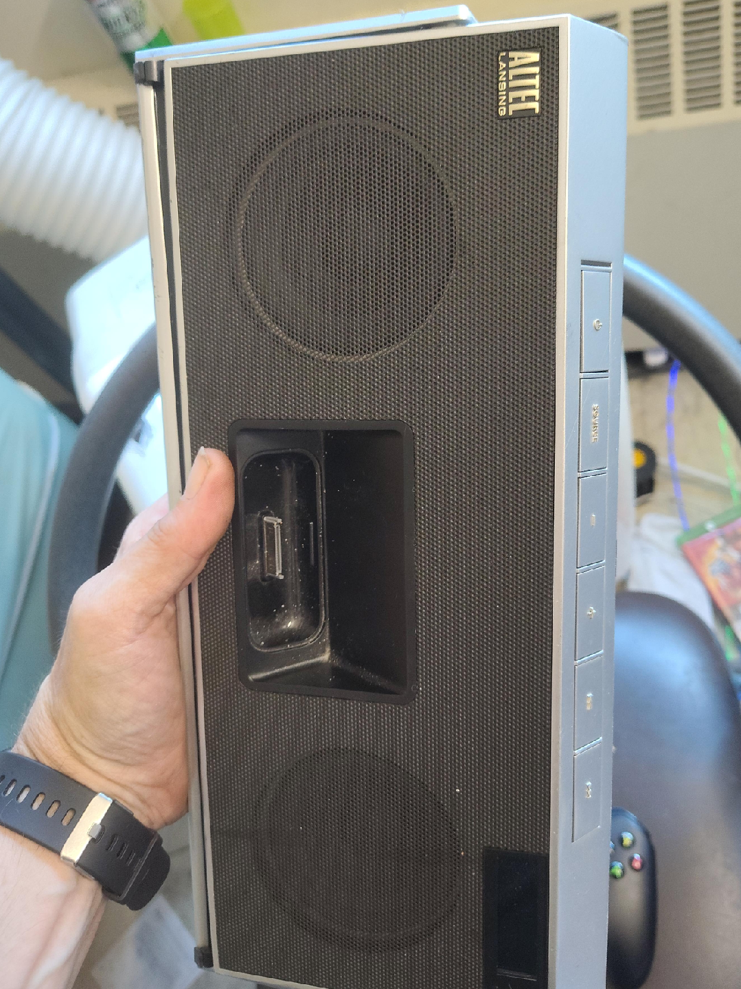 Selling an Altec Lansing Octiv M602 speaker! It has a dock for older Apple devices, and the speaker itself is in good shape. Perfect for anyone who wants some retro tech with great sound! just don't have the power cord (DC 7.5v -2A) . borrowed a friend's and it still sounds amazing .