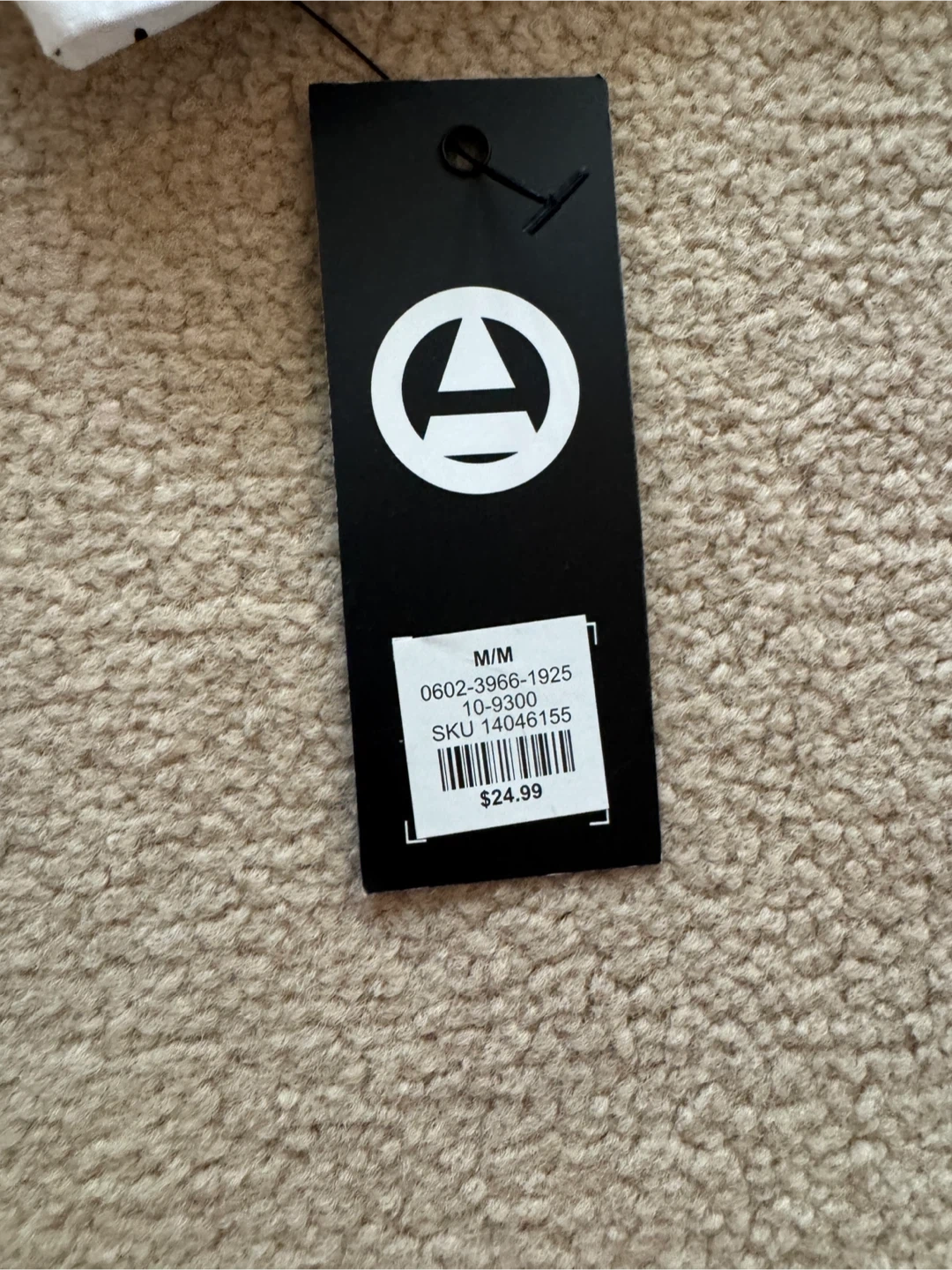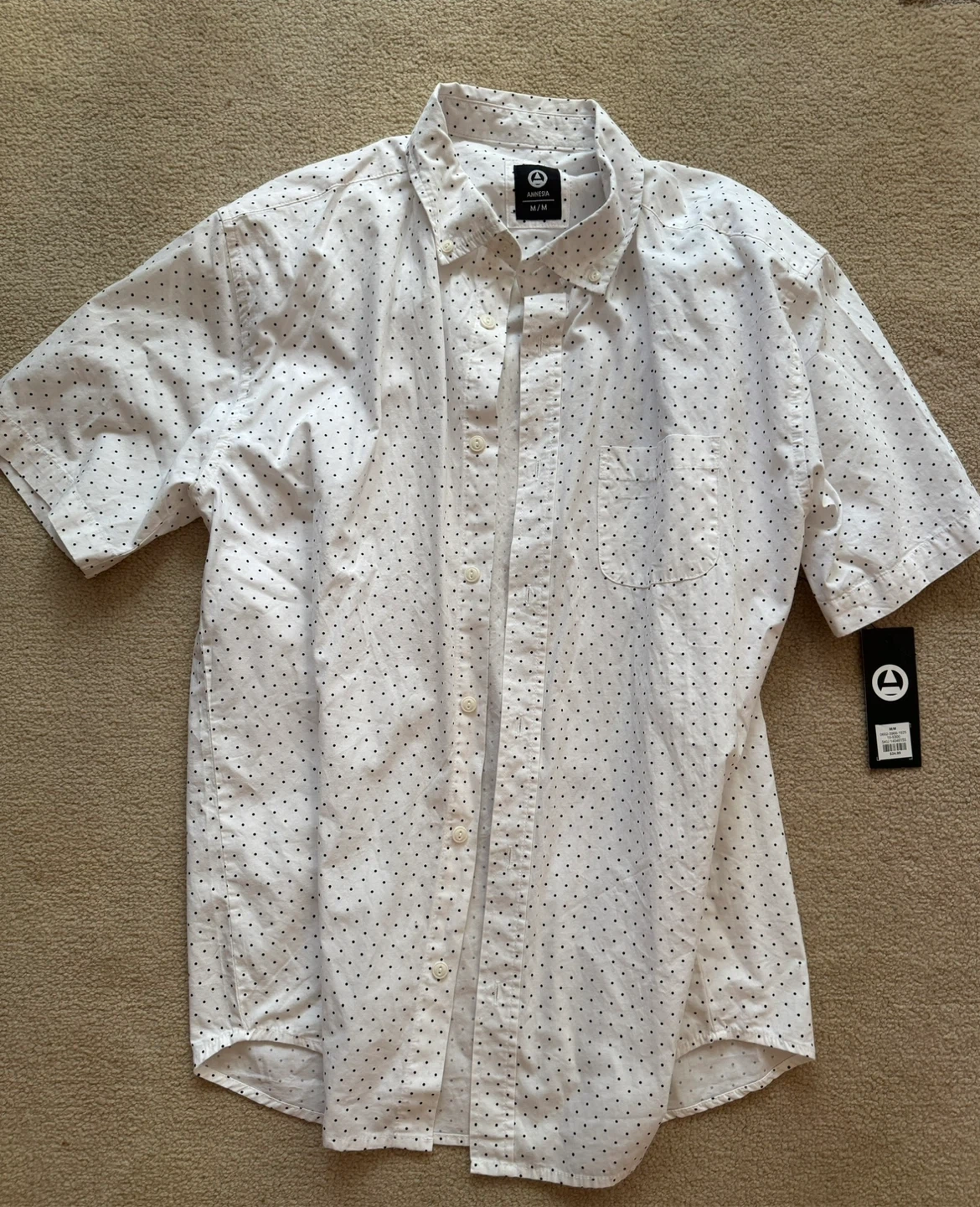 I'm selling a brand new Altitude shirt, still with tags! It's a stylish white button-up with a subtle polka dot pattern. The size is M/M. The tag shows it was originally $24.99