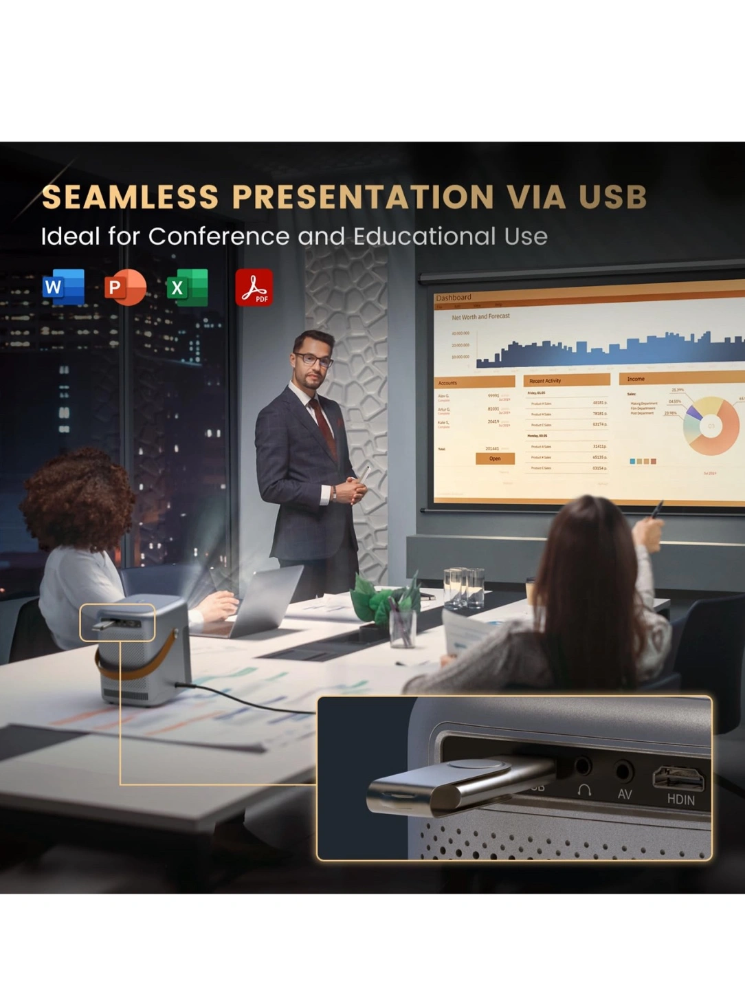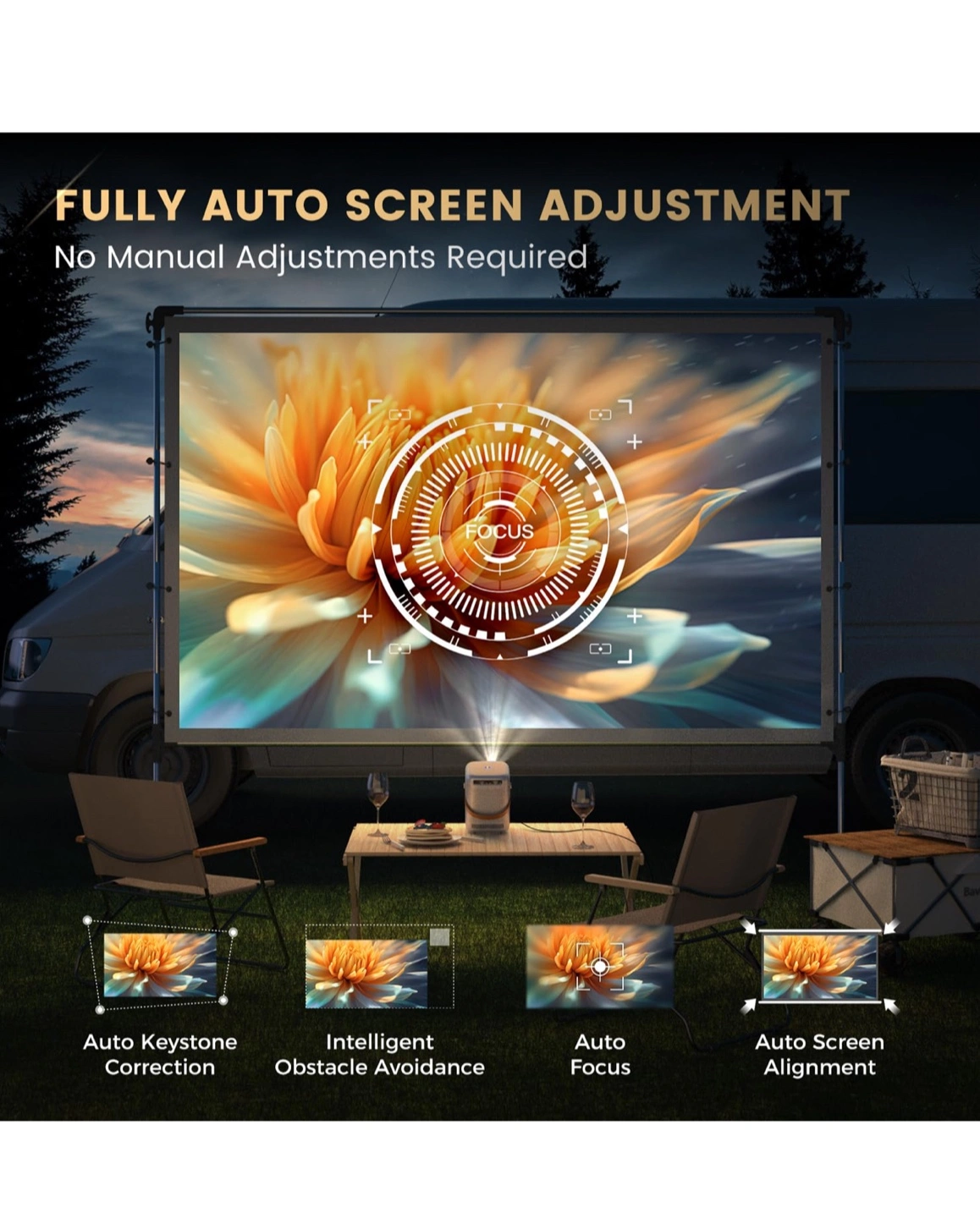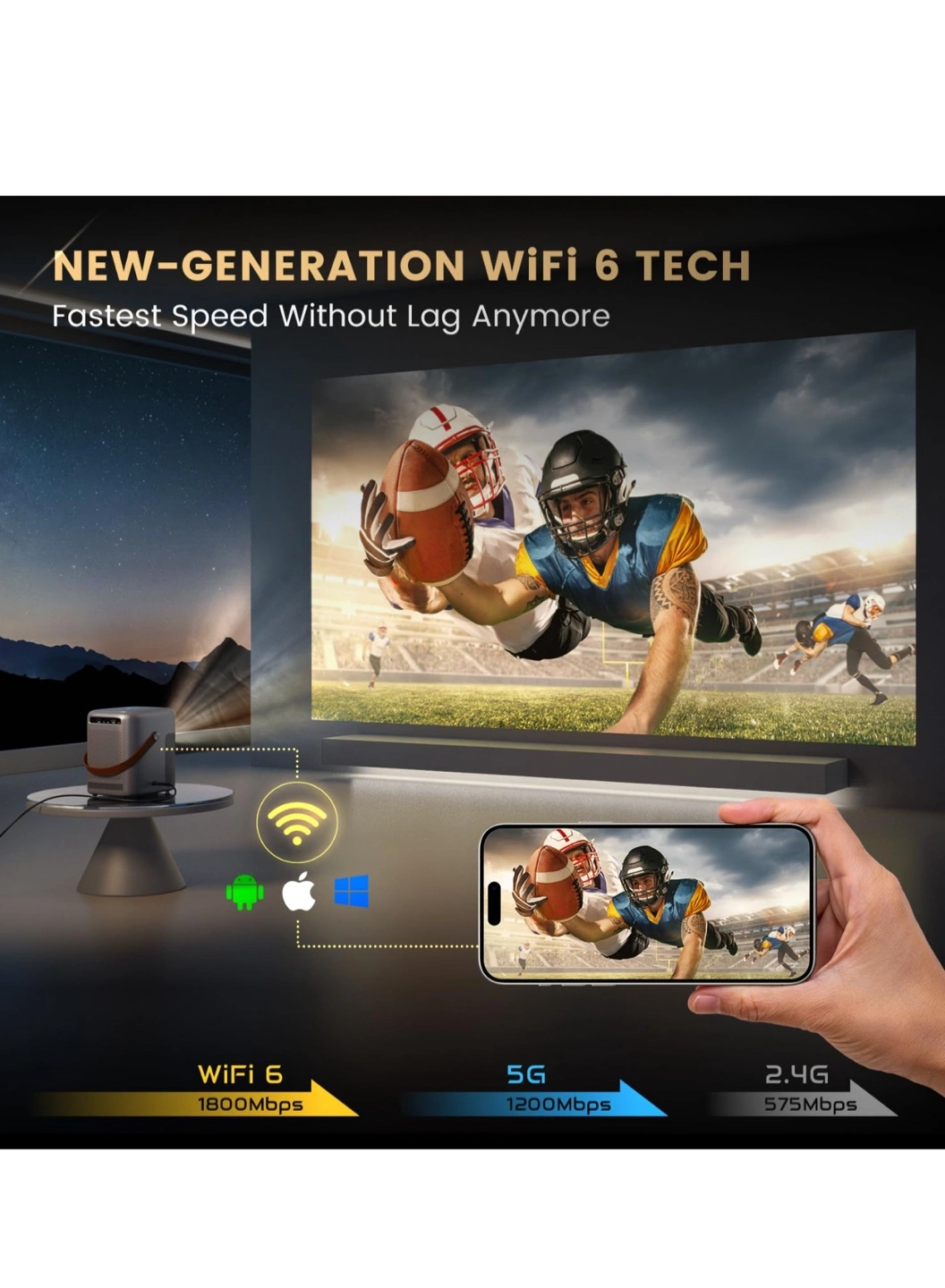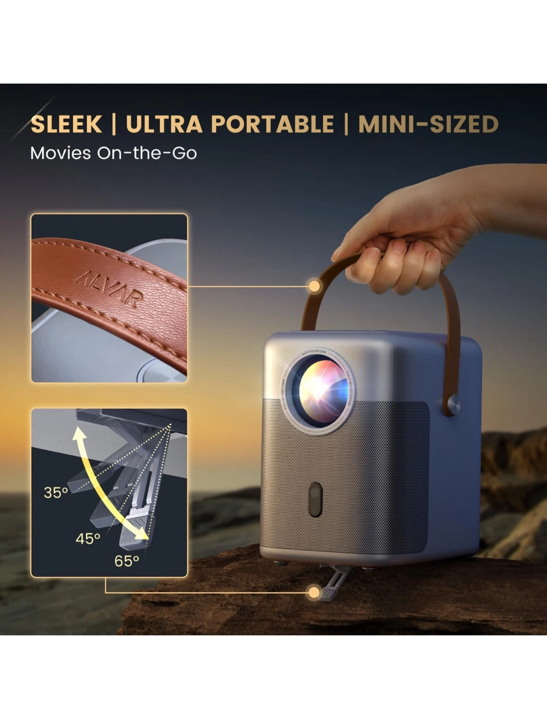 Check out this sleek and ultra-portable mini projector by Alvar! It's perfect for movies on-the-go. It features fully auto screen adjustment, so no manual adjustments are required. It also boasts new-generation WiFi 6 tech, offering the fastest speed without lag. Ideal for conference and educational use with seamless presentation via USB!