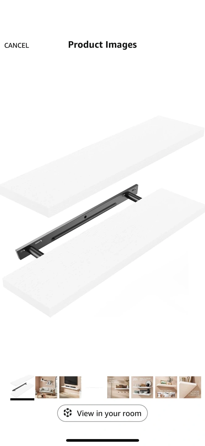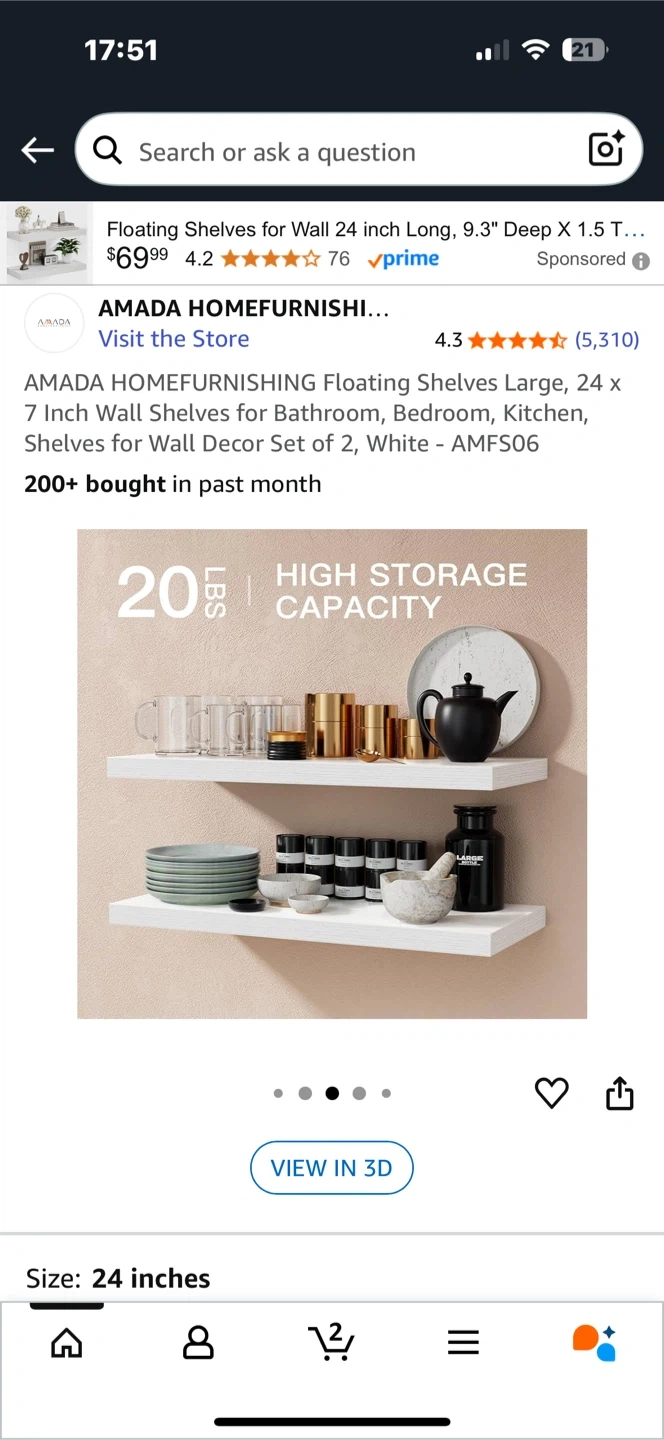 Selling a set of two AMADA HOMEFURNISHING floating shelves. They are white, 24 inches long, 9.3 inches deep, and 1.5 inches thick. These shelves are perfect for the bathroom, bedroom, kitchen, or living room. They can hold up to 20 lbs each, offering high storage capacity. Great for displaying decor!