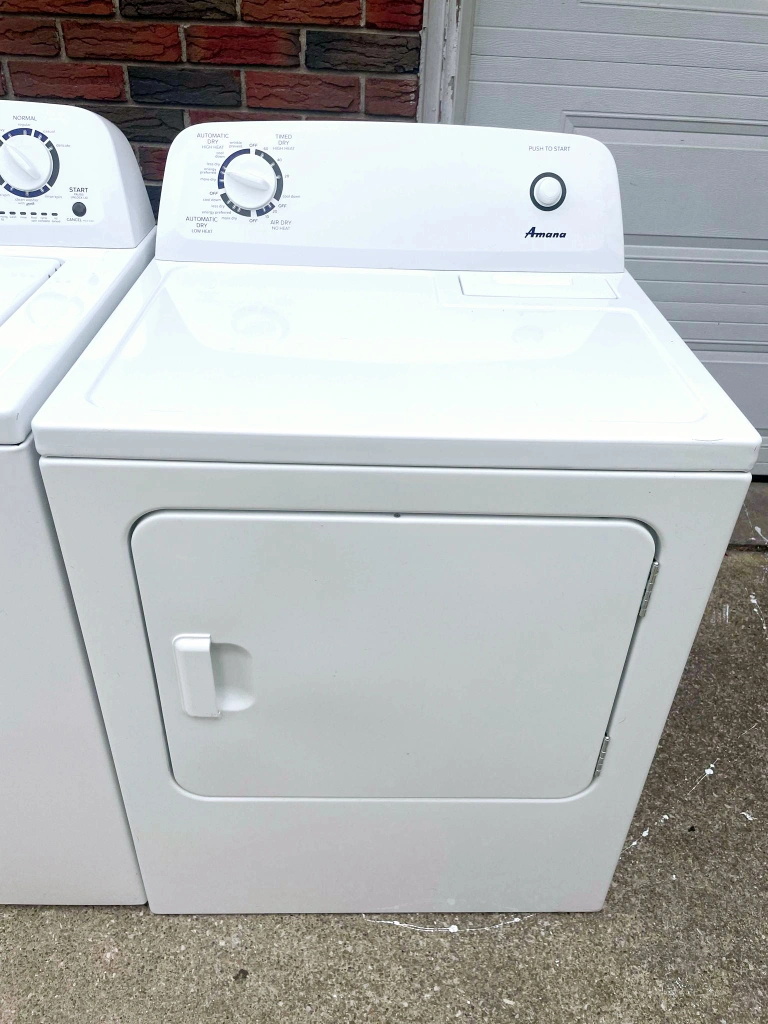 I'm selling a white Amana dryer. It's in good condition and ready to use. It has automatic and timed dry cycles, as well as an air dry cycle. Perfect for any laundry room!