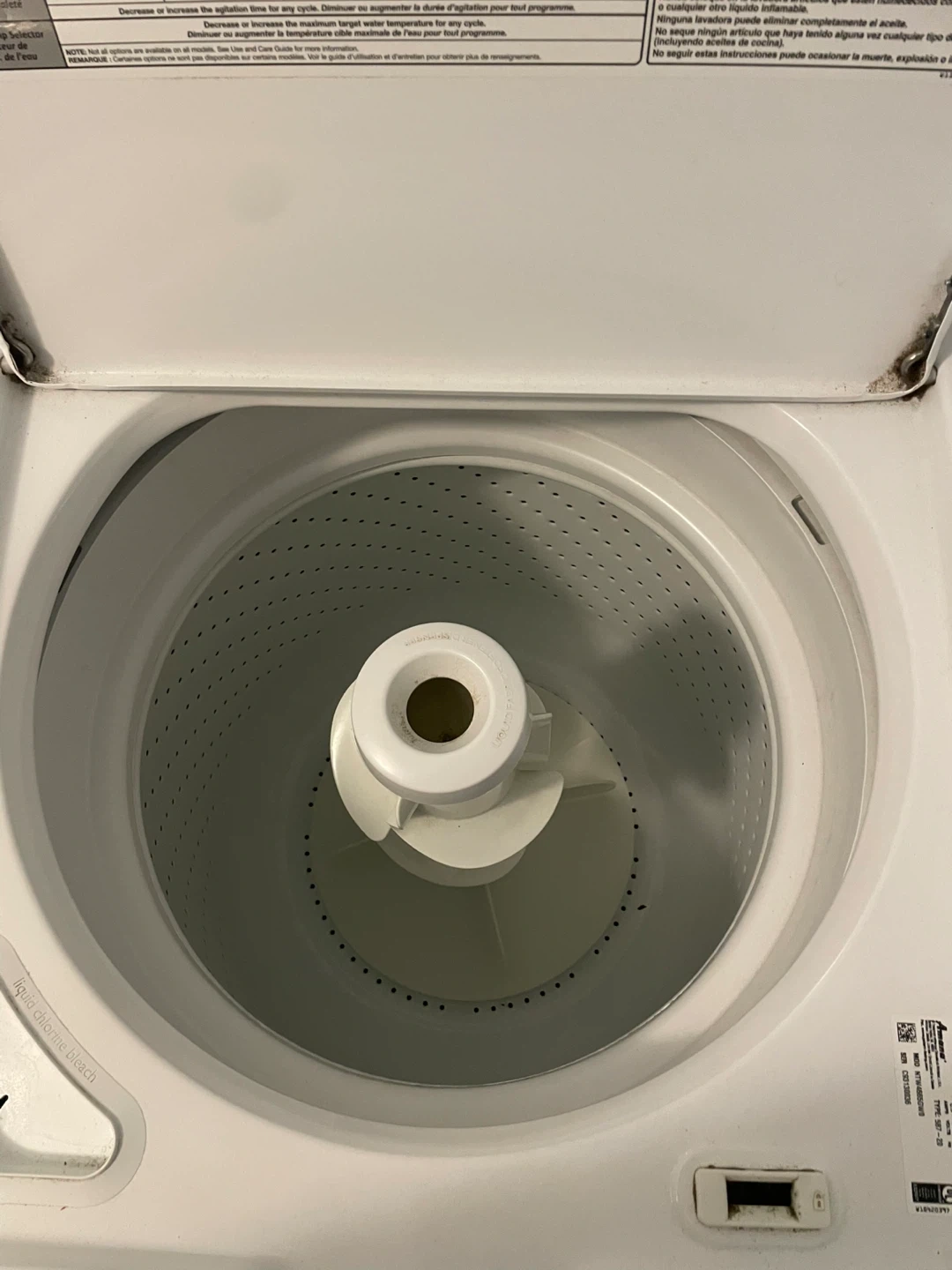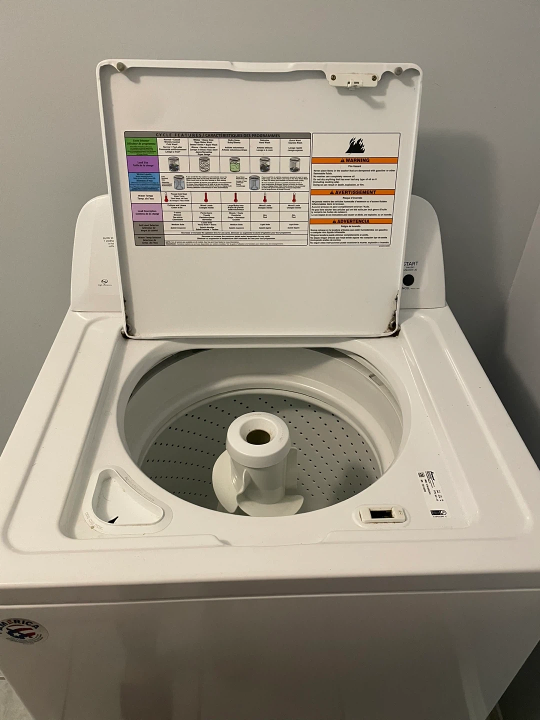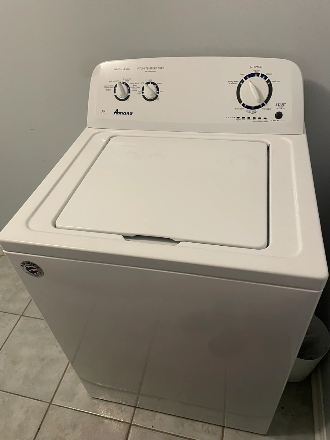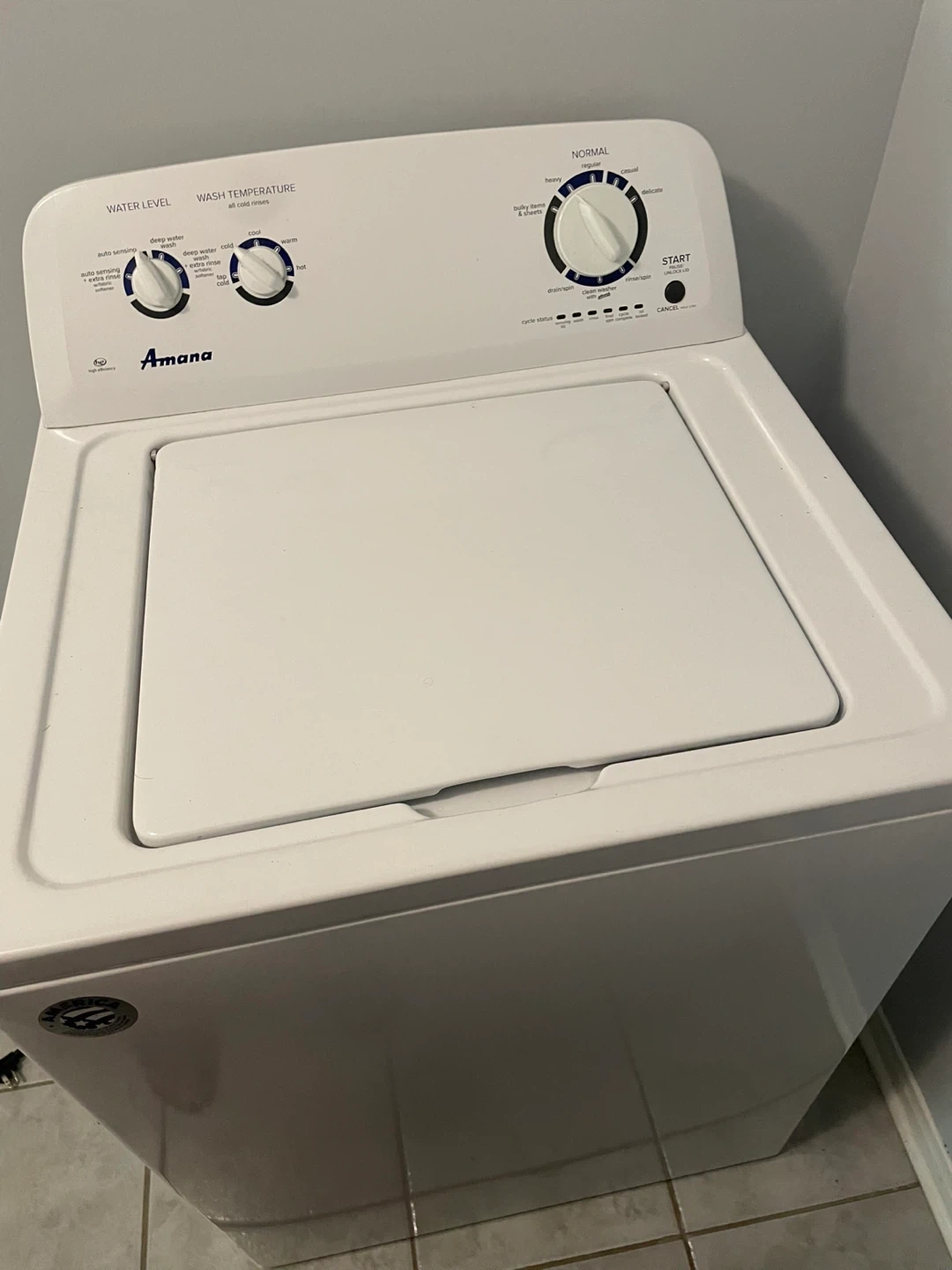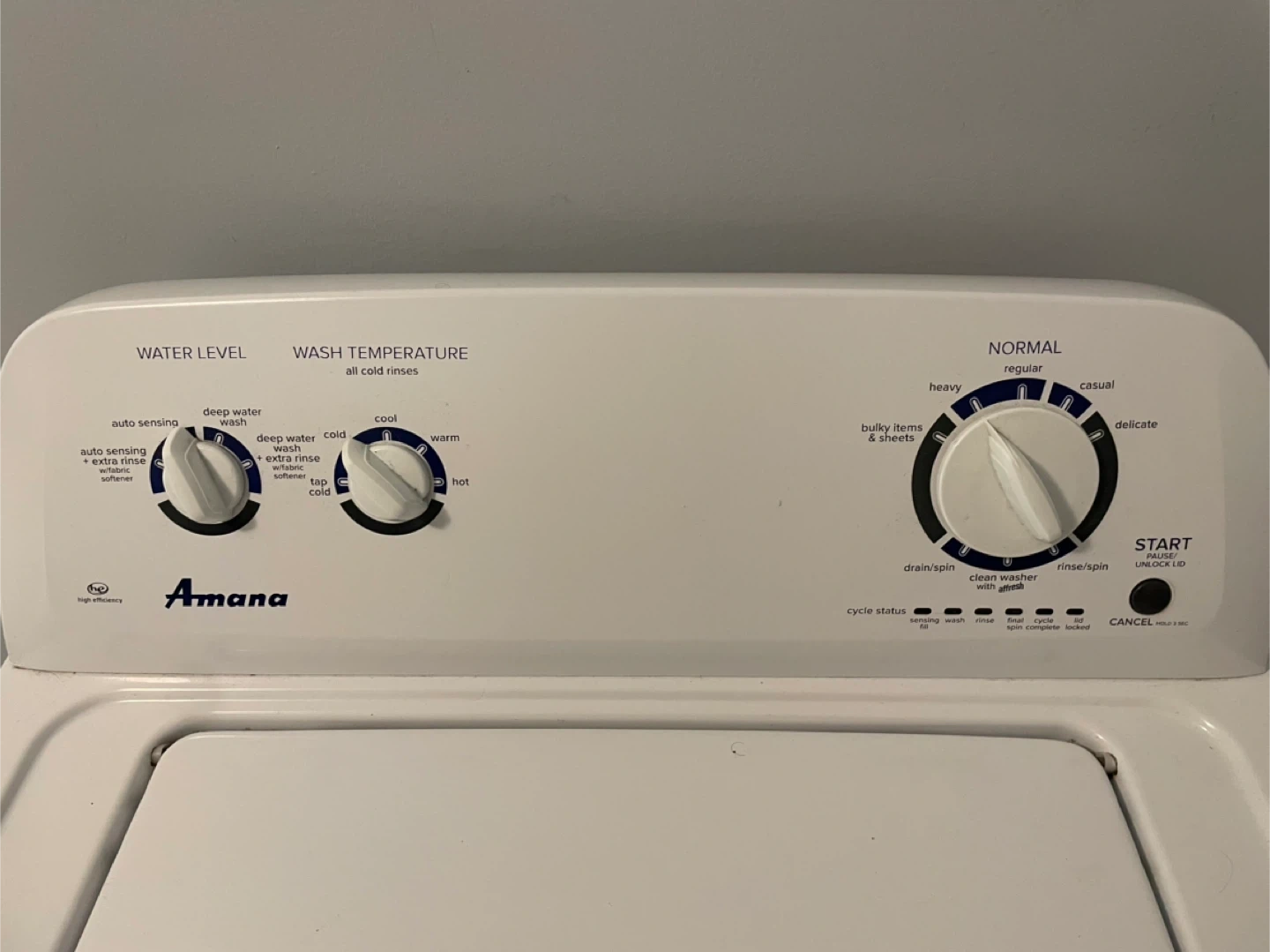 Selling an Amana washing machine in good condition. It's white and has various settings for water level, wash temperature, and cycle selection. Works perfectly fine. Selling because we got a new one to match our dryer.
