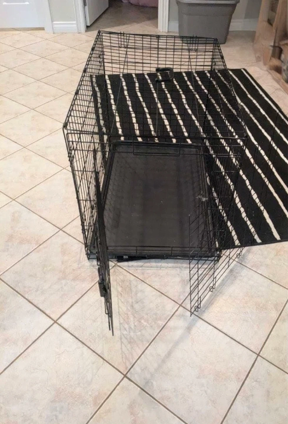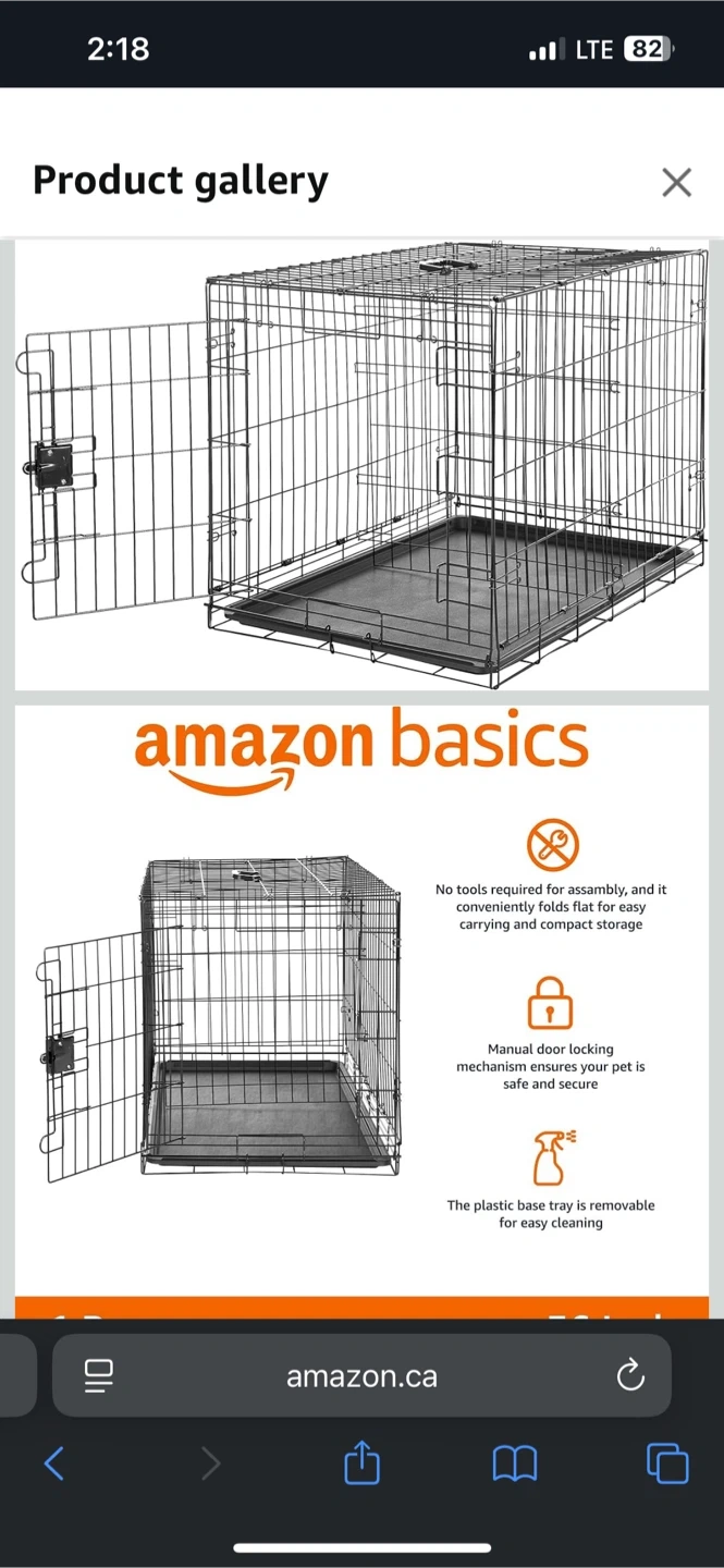 Selling an Amazon Basics dog crate. It's in great shape and ready for a new home! It features a manual door locking mechanism, plastic base tray is removable for easy cleaning, and it conveniently folds flat for easy carrying and compact storage Measurements: 91L x 58W x 64H cm