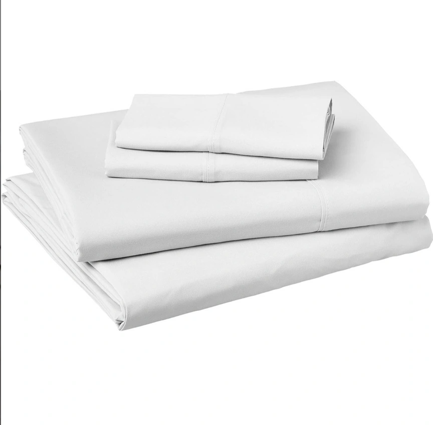 Selling a brand new Amazon Basics microfiber sheet set in white! This easy-care set is made with soft, long-staple microfiber and has 14" deep pockets. It includes one flat sheet, one fitted sheet, and pillowcases. The size is not specified, but the packaging is included
