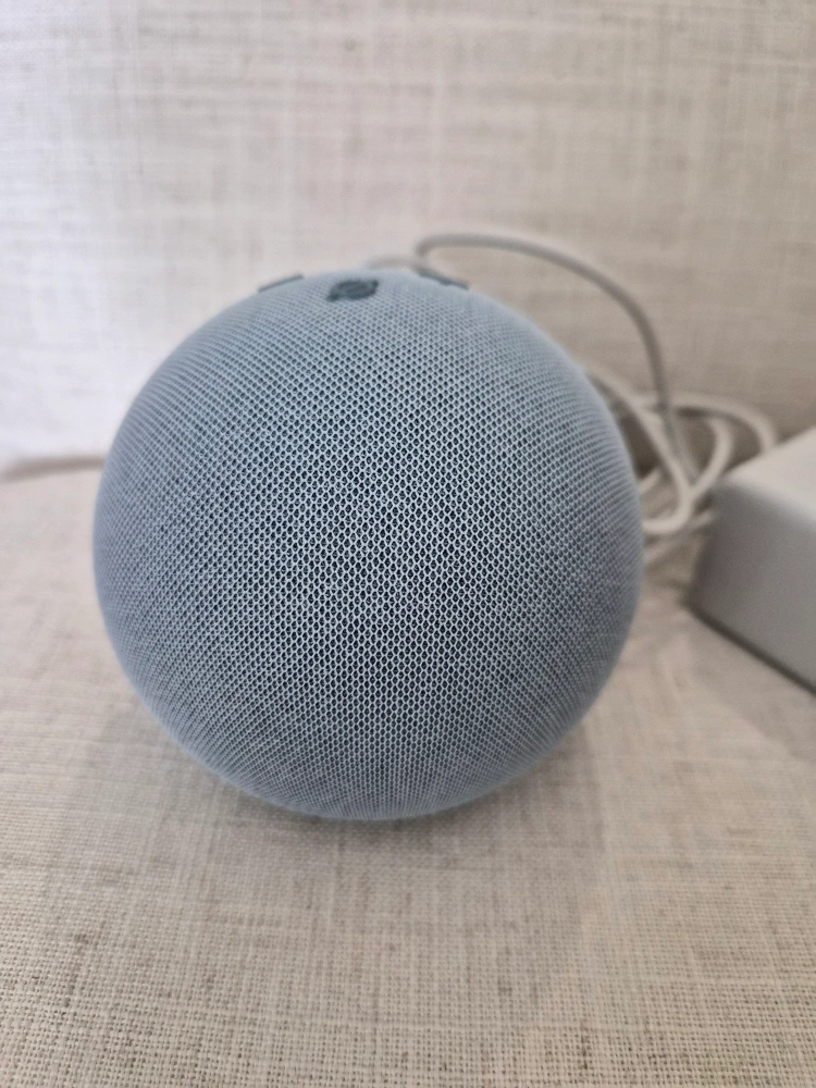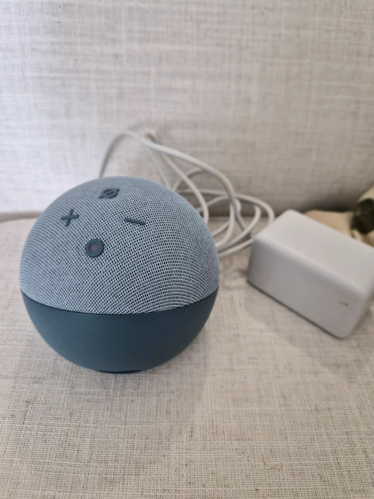 Selling an Amazon Echo Dot (4th Generation) in blue. It's in great condition and comes with the power adapter. This smart speaker is perfect for any room and makes a great addition to your smart home setup