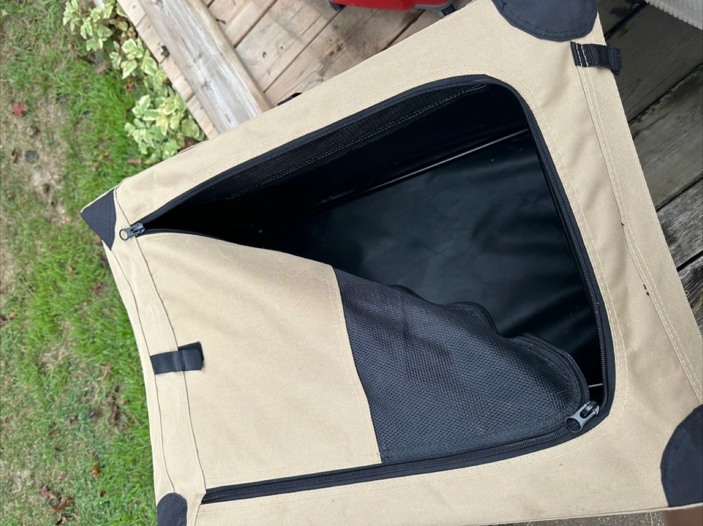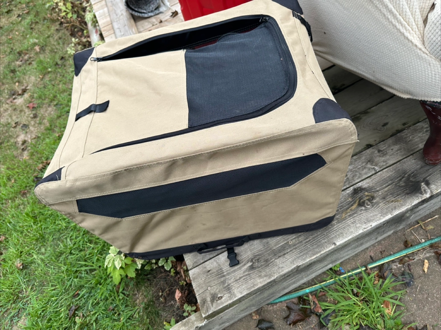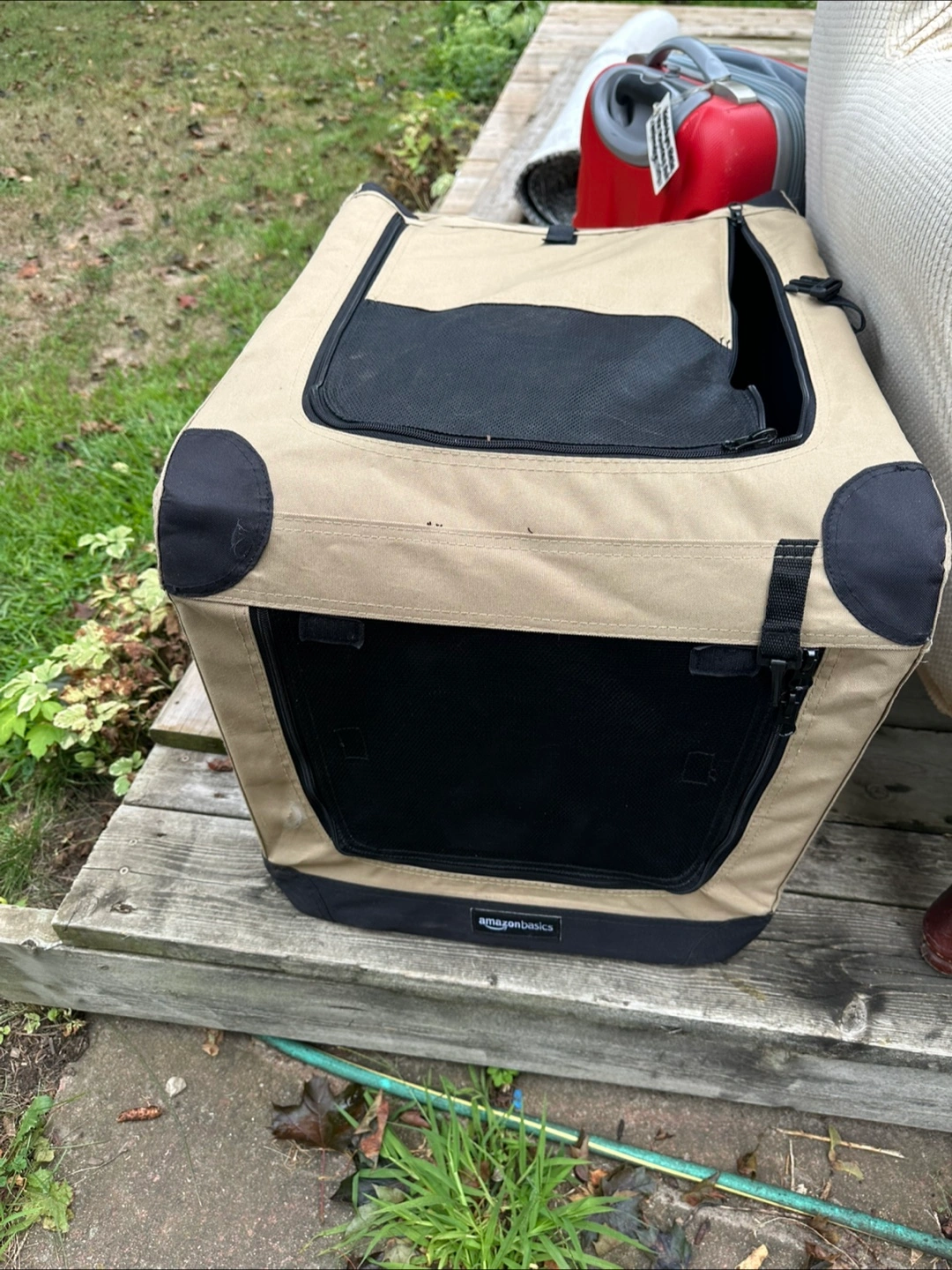 Selling a portable folding soft dog crate from AmazonBasics. It's in great condition and perfect for travel or home use. The crate is easy to set up and fold down for storage. It features mesh windows for ventilation and a zippered front door for easy access.