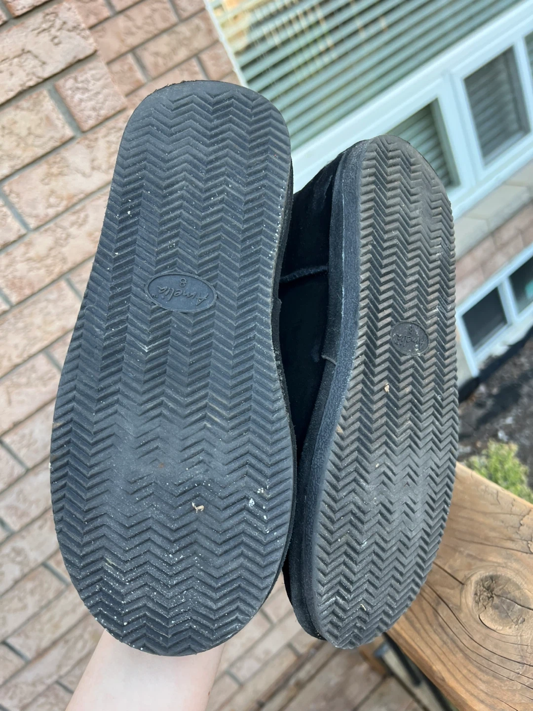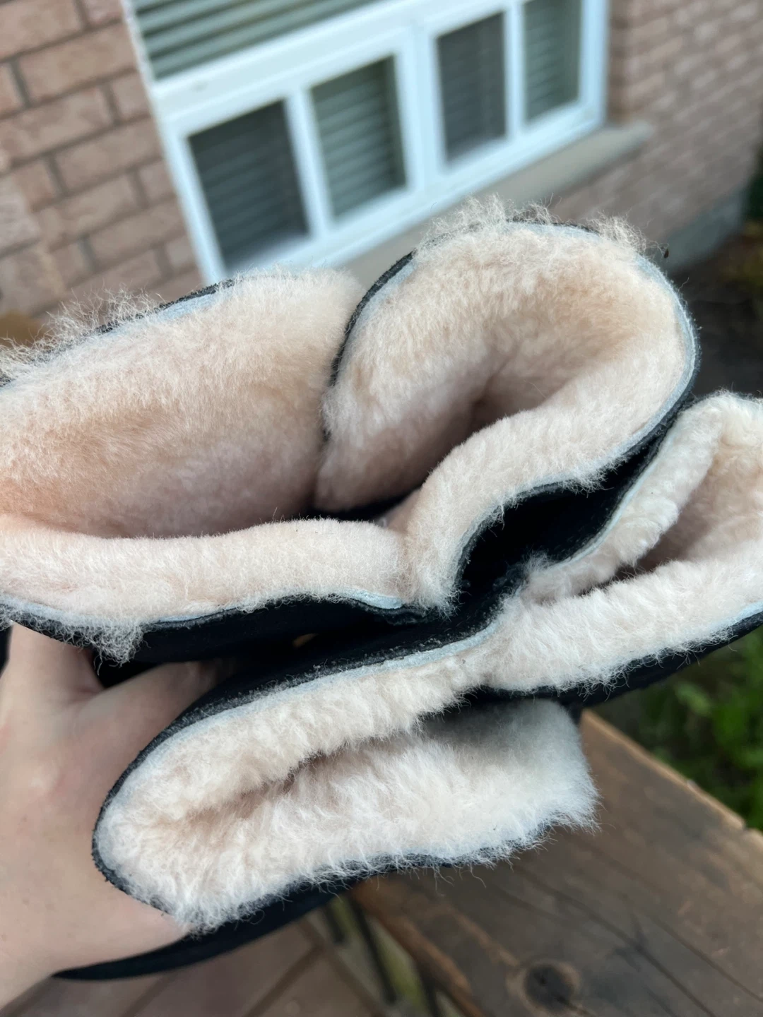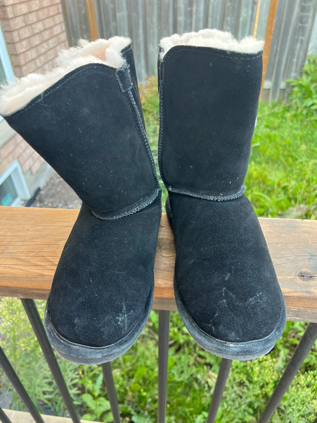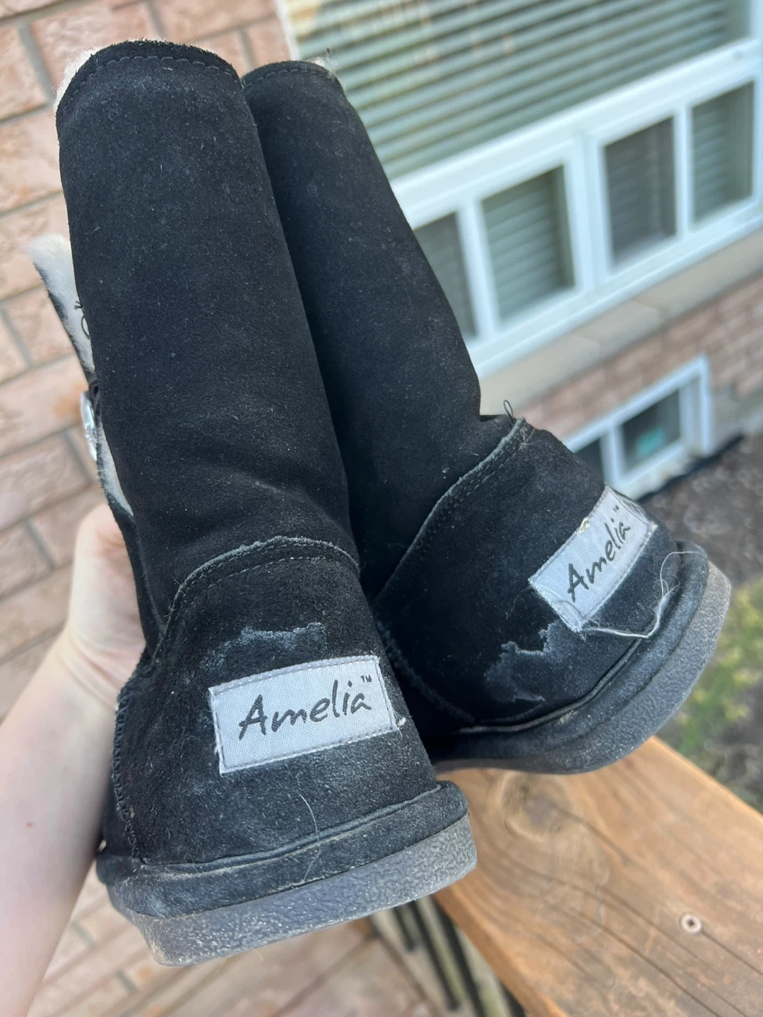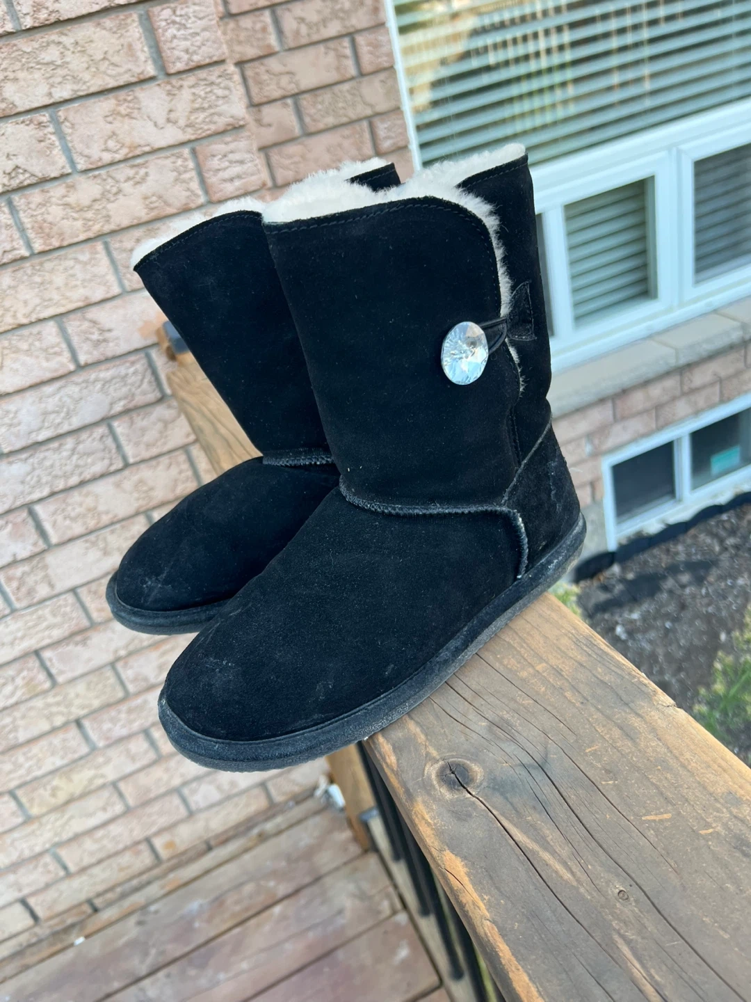 Cozy black winter boots from Amelia, perfect for keeping your feet warm during those chilly Canadian days! They're a size 8 and have a cute button detail on the side. The inside is lined with soft, plush material for extra comfort.