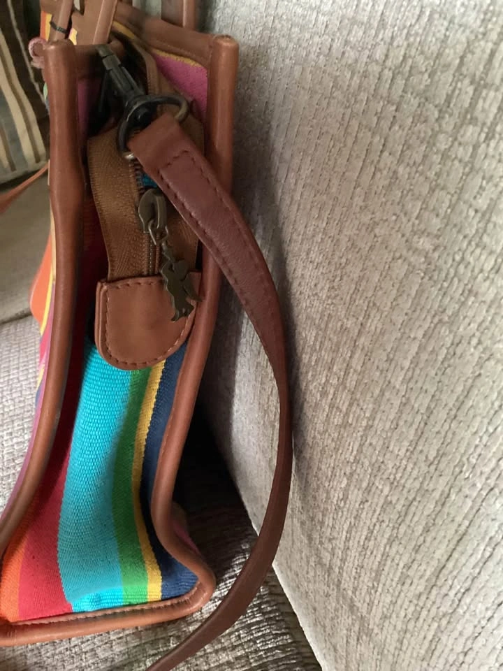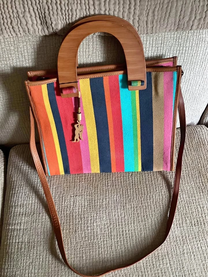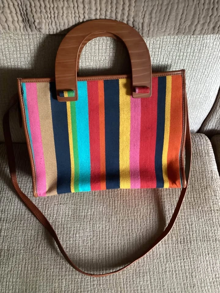 American Angel Rainbow Striped Cotton Bag Purse with Wood Handles in like-new condition. Pickup only in Aurora.