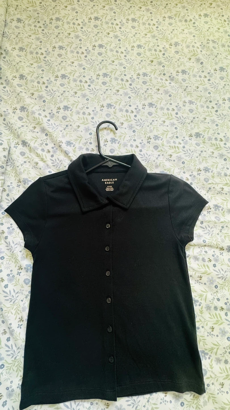 Selling a cute American Eagle black button-up shirt in size small! It's in great condition and perfect for a casual or dressed-up look. The material is soft and comfortable, great for everyday wear!