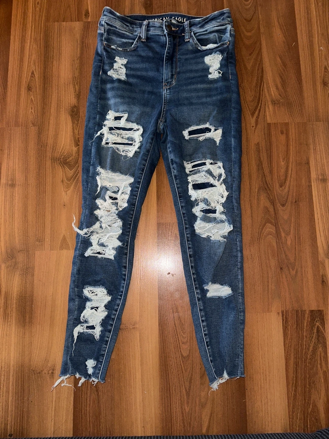 Selling a pair of American Eagle jeans with a distressed look. They're in good condition and have a stylish, worn-in vibe. Perfect for a casual look!