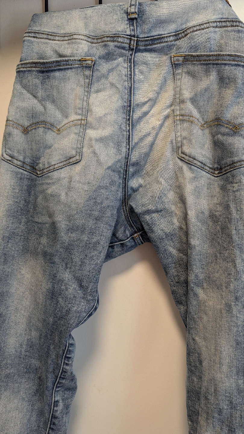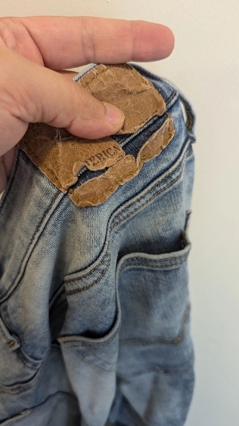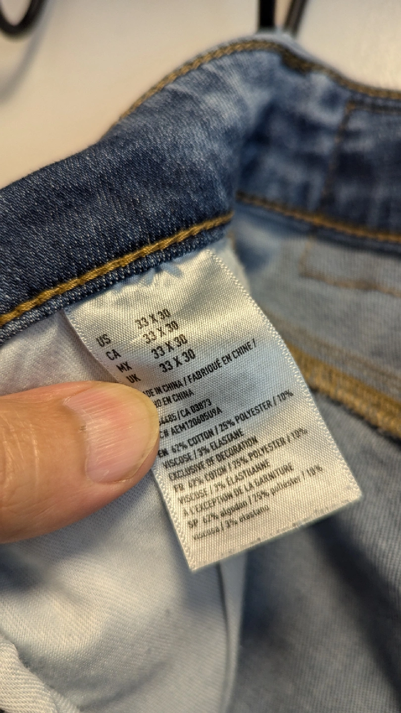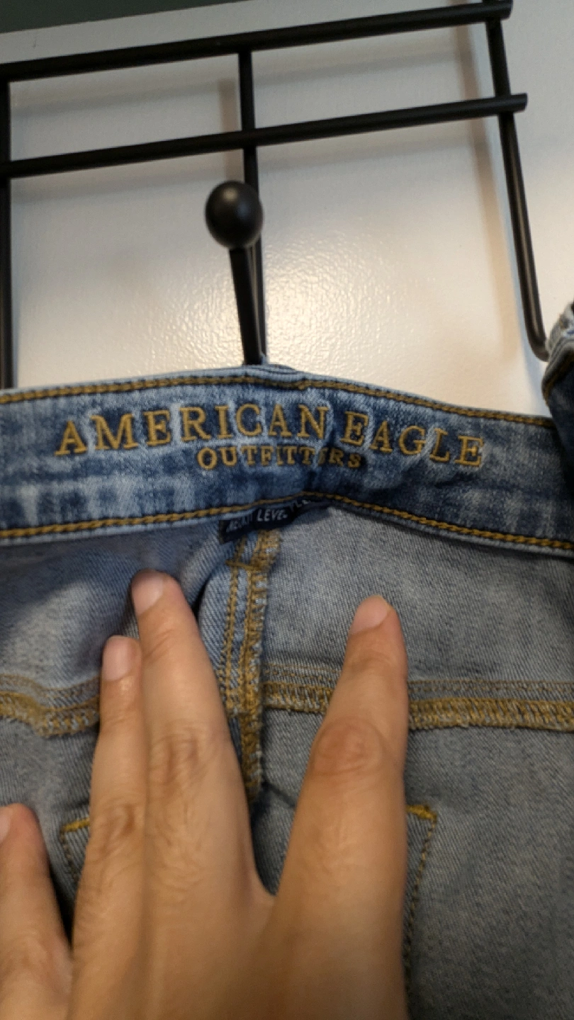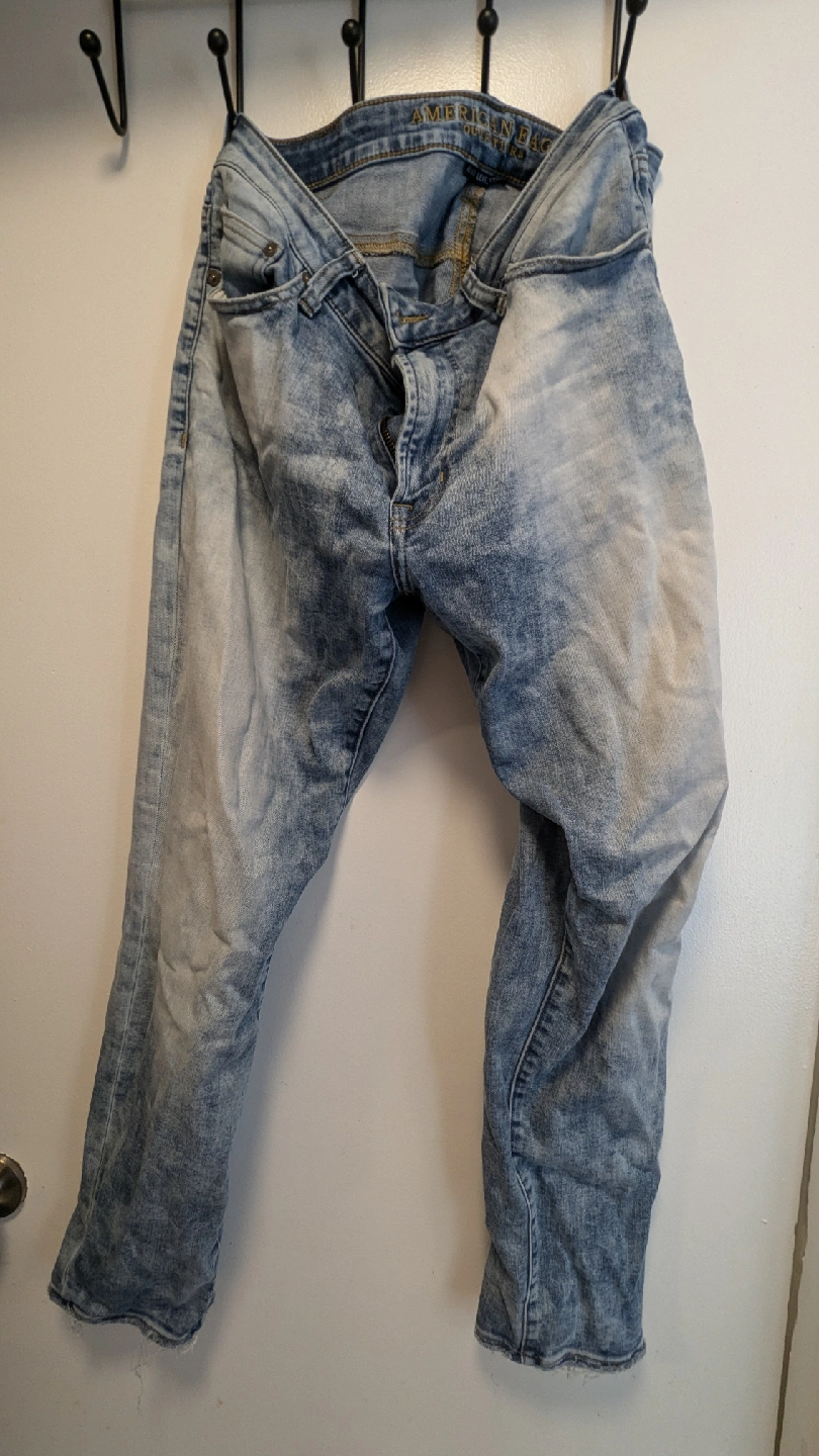 Selling a pair of American Eagle jeans in size 33x30. They're in gently used condition, perfect for everyday wear. The jeans are made of 62% cotton, 25% polyester, and 13% elastane, offering a comfortable fit.