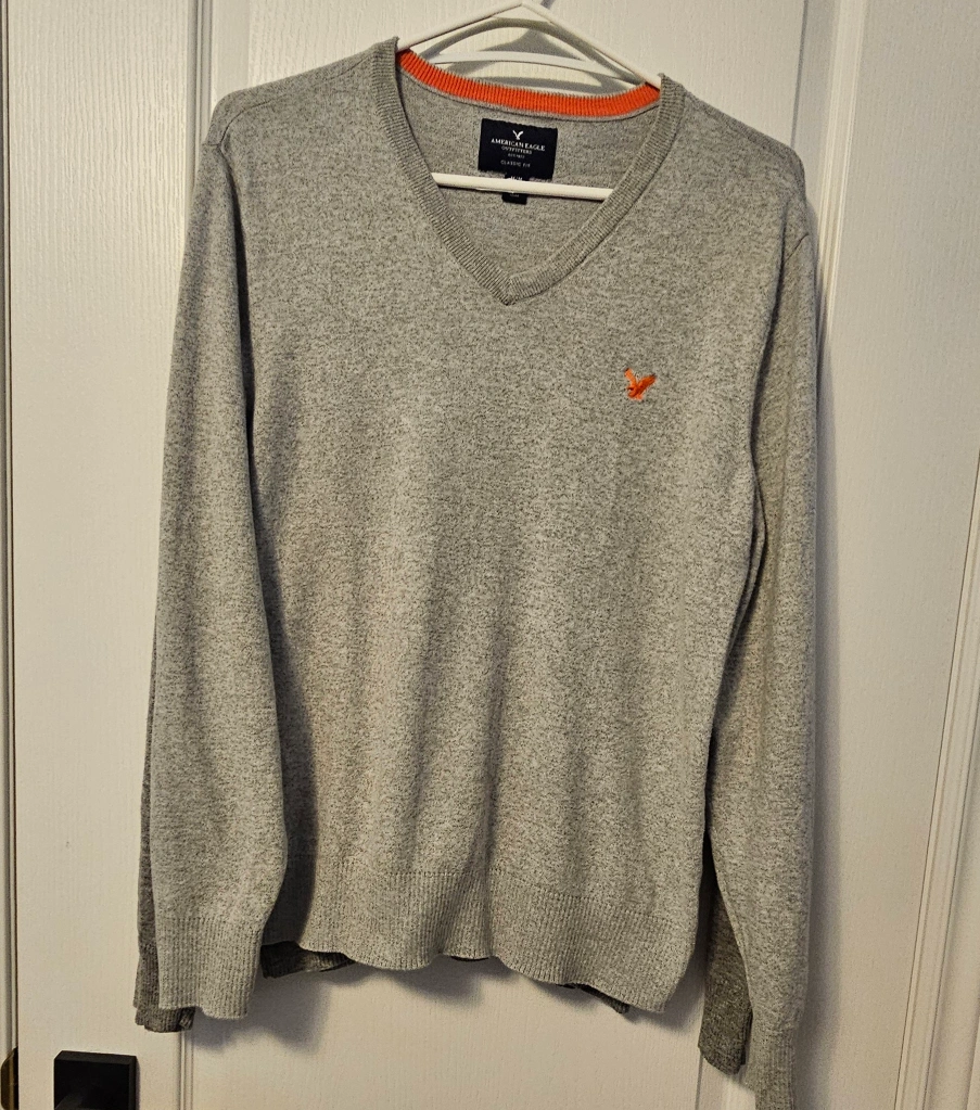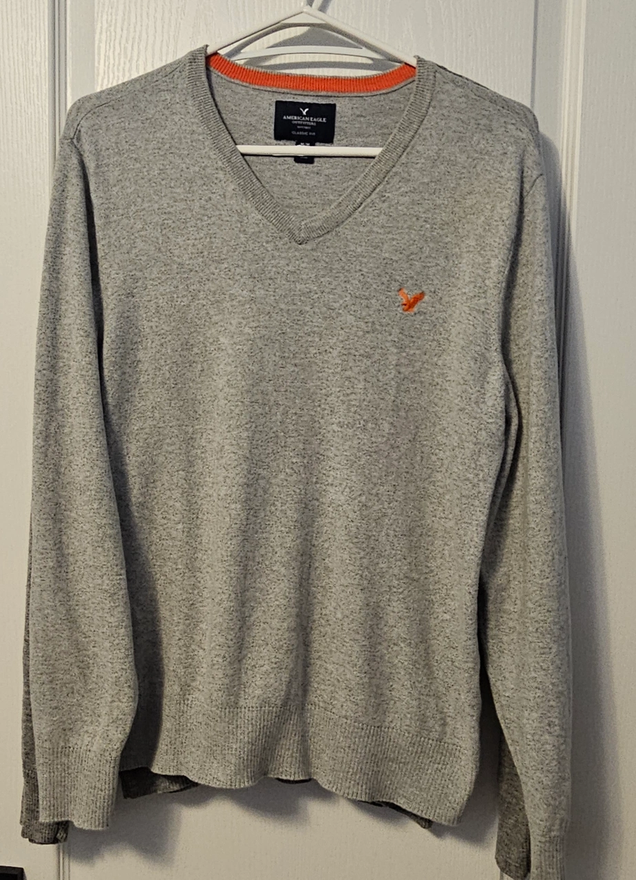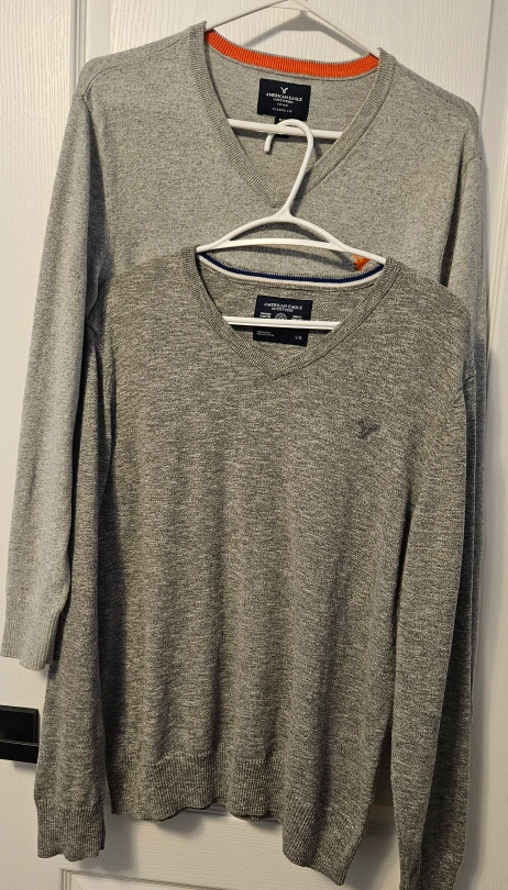 Two gently used American Eagle Outfitters V-neck sweaters in size large & Medium. Both are a heathered grey colour. They're in excellent condition and ready for a new home! $15 for Both!