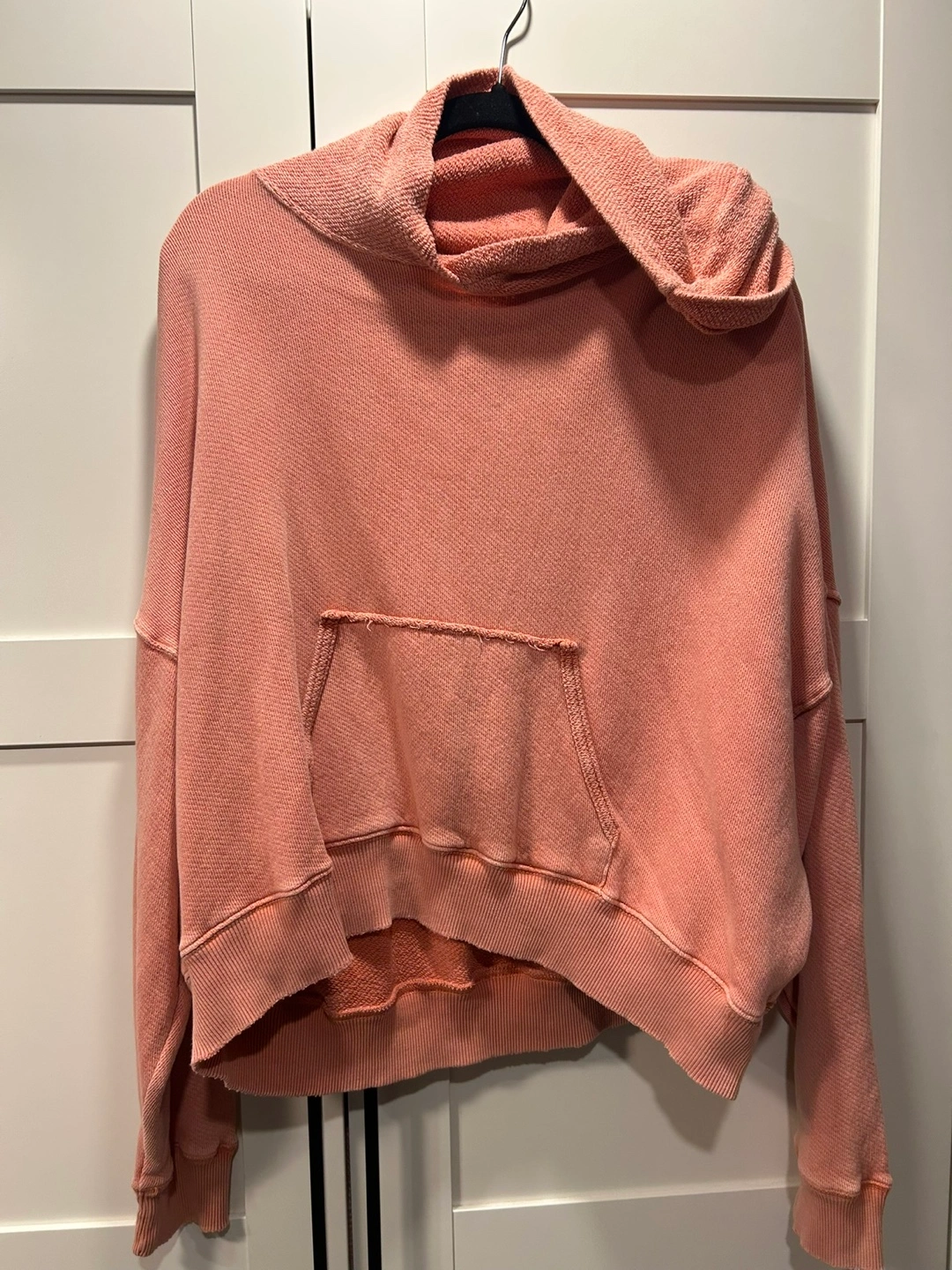 Dusty rose coloured oversized hoodie. Relaxed fit, cropped length. Features a small kangaroo pocket and a mock neck. Shows some distressing around the hem.
