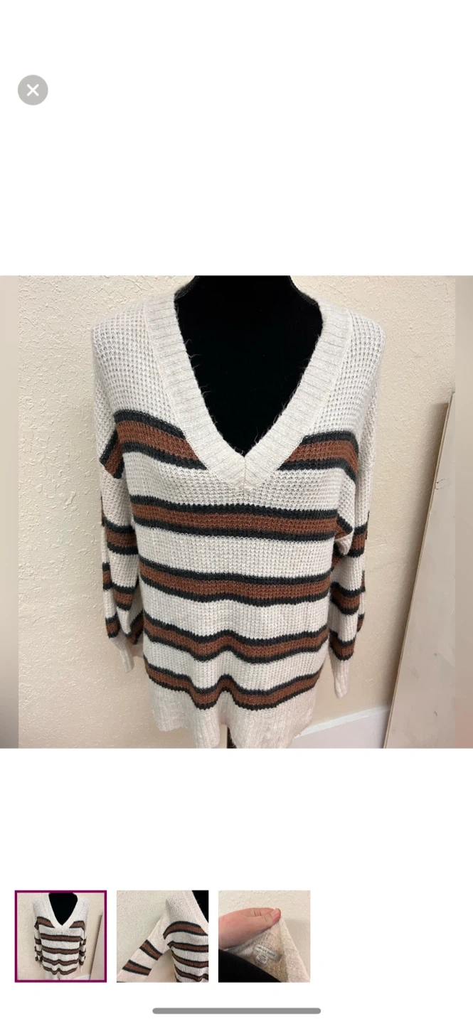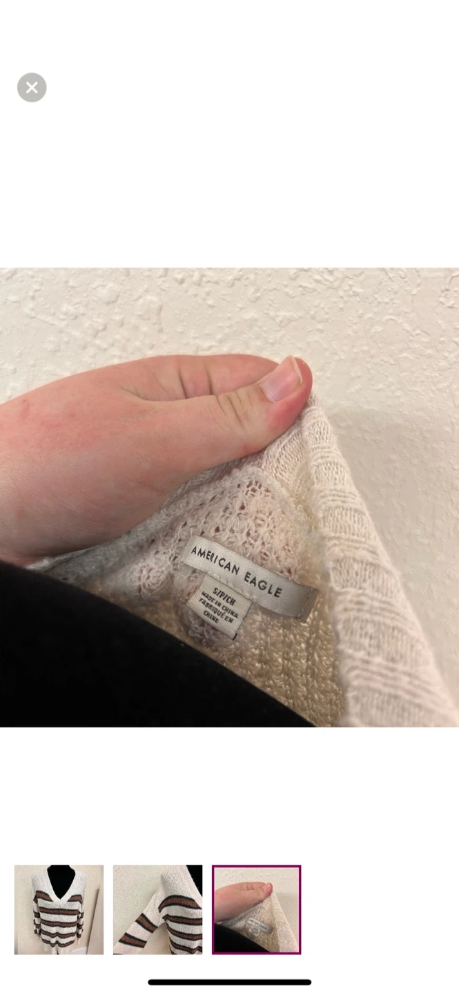 American eagle. Knit sweater. Brown striped. Size small. Brand new condition $15 Pickup between kincardine & ripley or I can arrange delivery in port Elgin-Owen sound, walkerton-Durham, wingham-listowel-kw/cambridge, goderich-bayfield, Woodstock & Arthur-Orangeville-Newmarket-Lindsay-Peterborough AREAS.