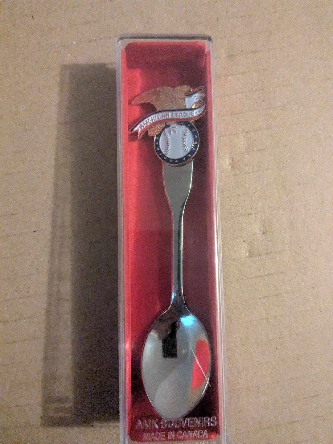 Selling a brand new, in-box American League souvenir spoon! It's a great collectible item, perfect for baseball fans. The spoon features an eagle and baseball design. Made in Canada by AMK Souvenirs, it's a unique piece to add to your collection